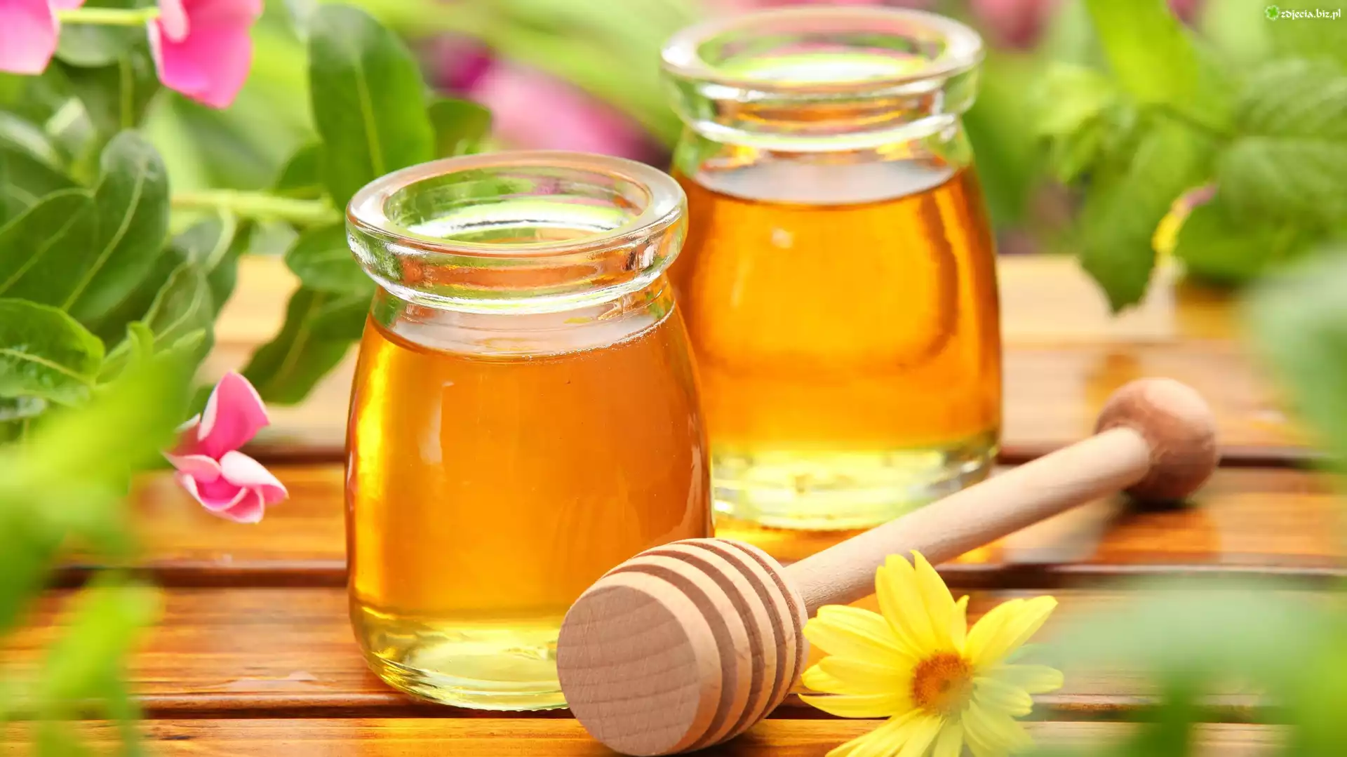 Zdjęcie Miód, Szklane, Pojemniki, Nabierak, Kwiaty, Deski