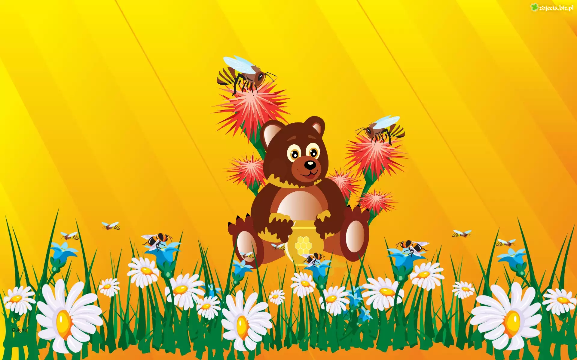 Zdjęcie Miś, Miód, Kwiaty, Pszczoły, Grafika, Dla dzieci