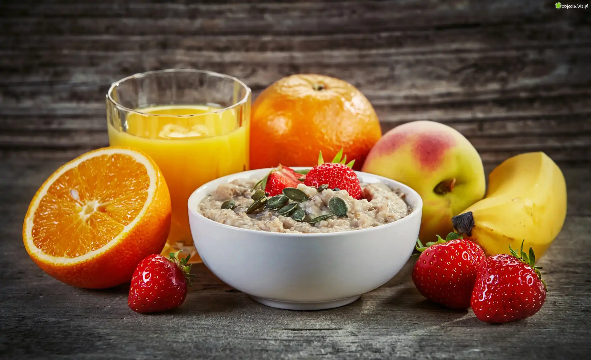 Zdjęcie, Kompozycja, Miseczka, Płatki owsiane, Pomarańcze, Truskawki, Banan, Sok