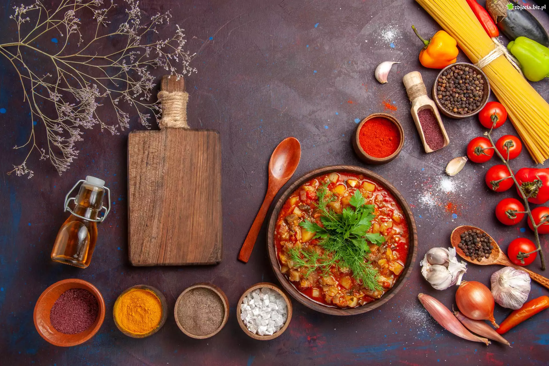 Zdjęcie Przyprawy, Miseczki, Drewniane, Zupa, Warzywa, Deseczka, Sznurek