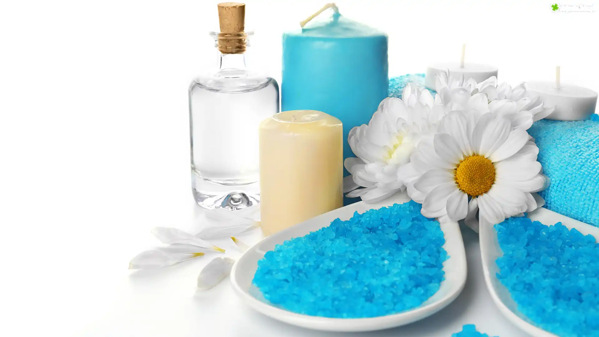 Zdjęcie, SPA, Miseczki, Sól, Kwiaty, Margerytki, Świeczki, Olejek