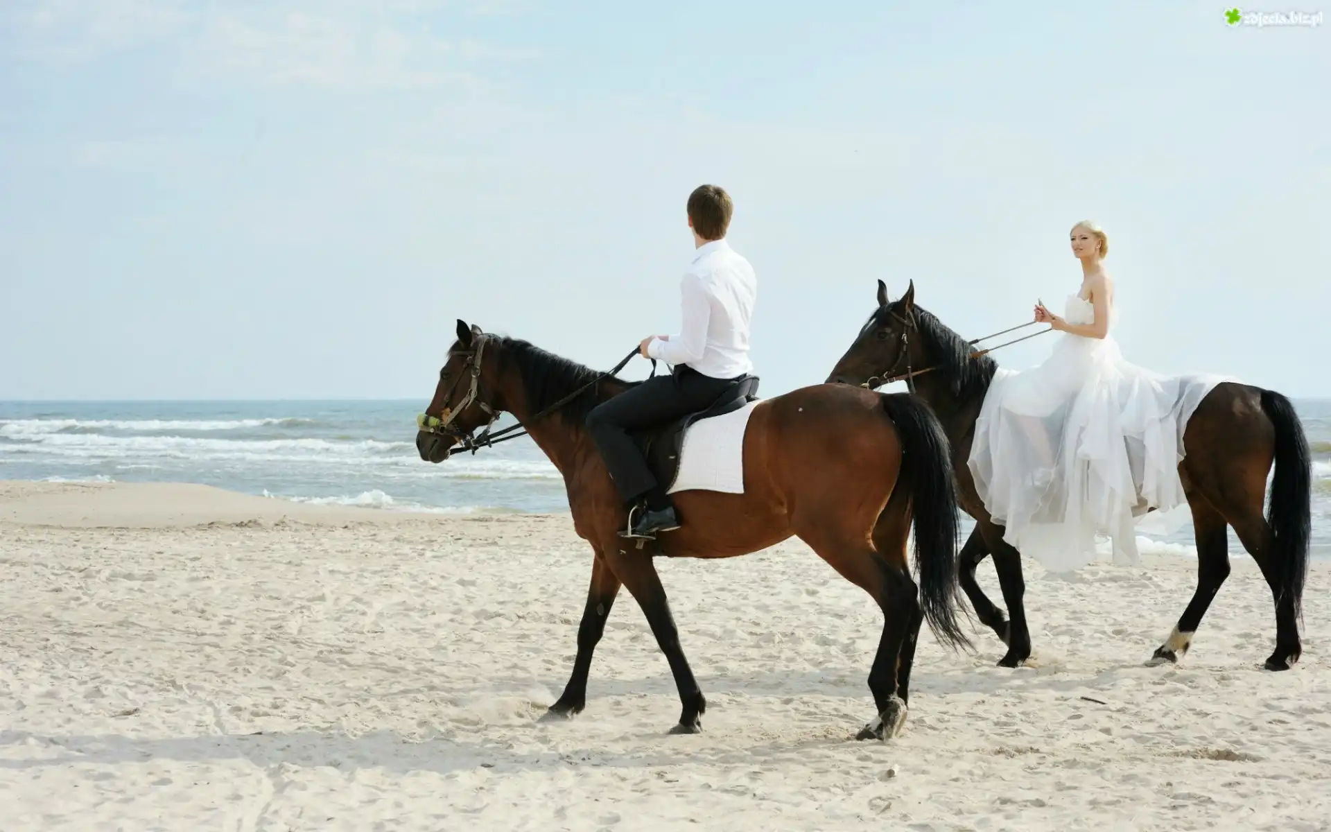 Zdjęcie Młoda, Para, Konie, Plaża, Morze