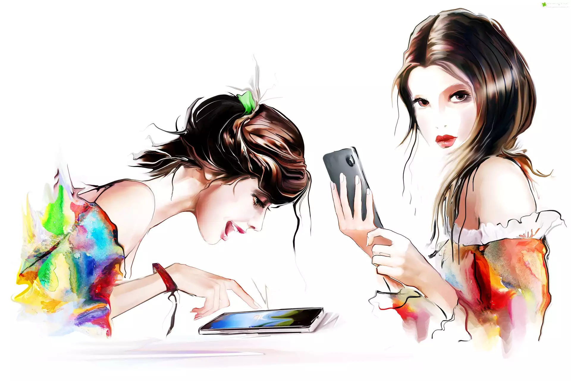 Zdjęcie, Młode Dziewczyny, Tablet, Komórka, Grafika, 2D