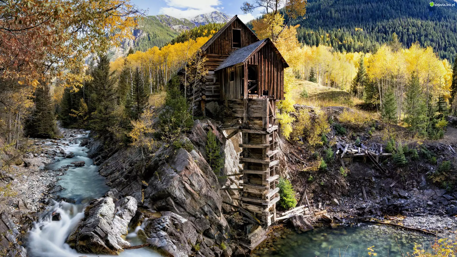 Zdjęcie Stany Zjednoczone, Stan Kolorado, Jesień, Młyn Crystal Mill, Rzeka Crystal River, Skały