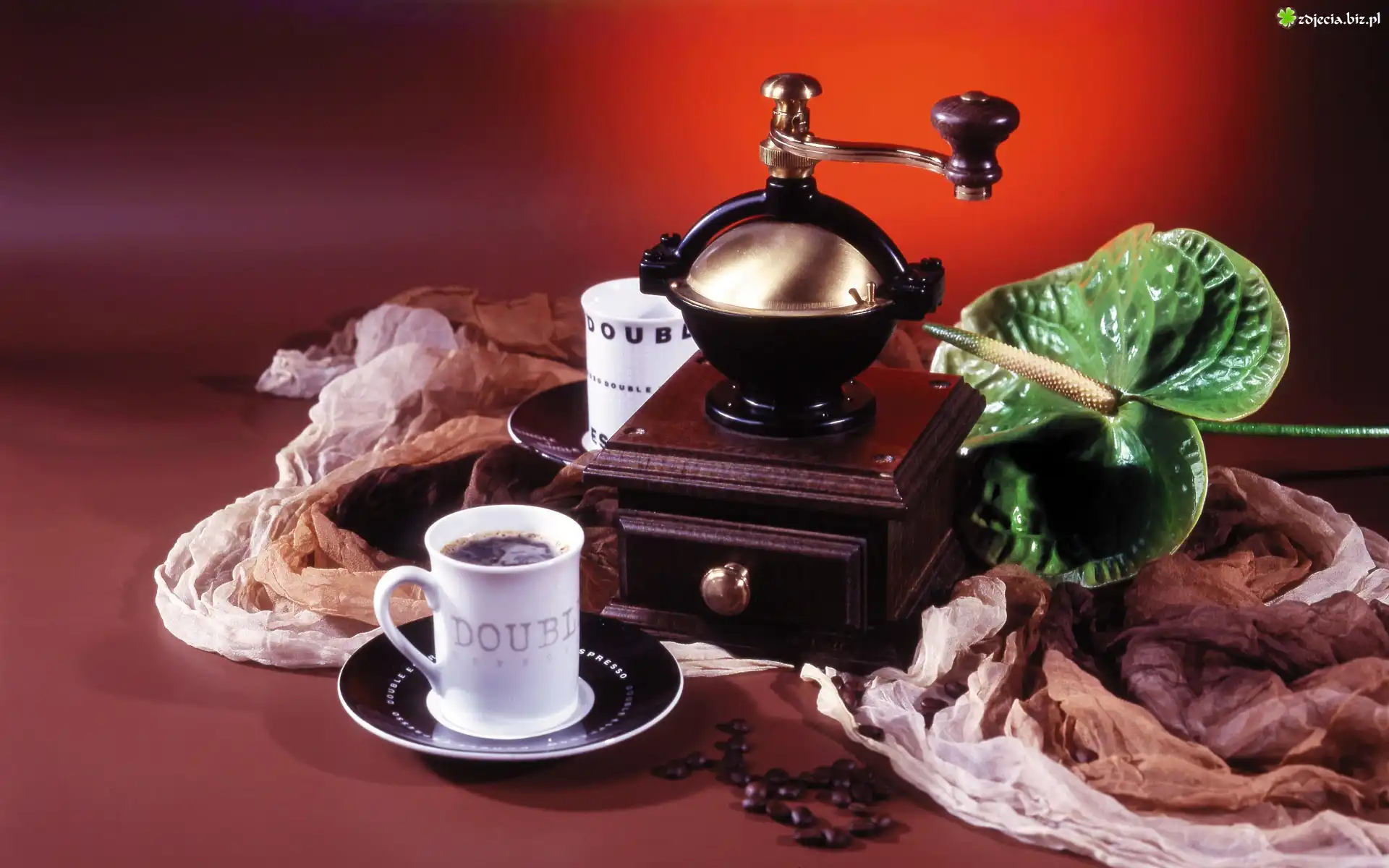 Zdjęcie Młynek, Kawa, Filiżanki, Kwiat, Szal