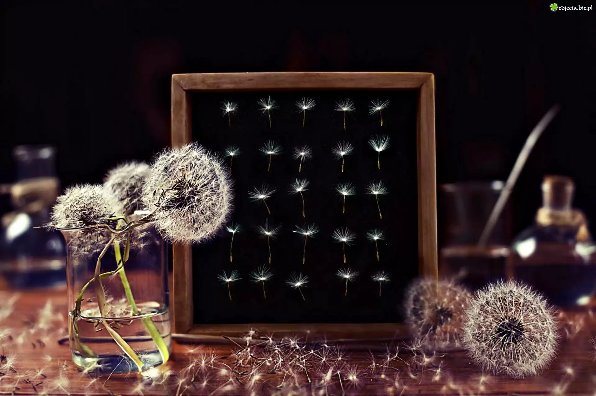 Zdjęcie Mniszek, Nasiona, Ramka, Szklanka, Woda