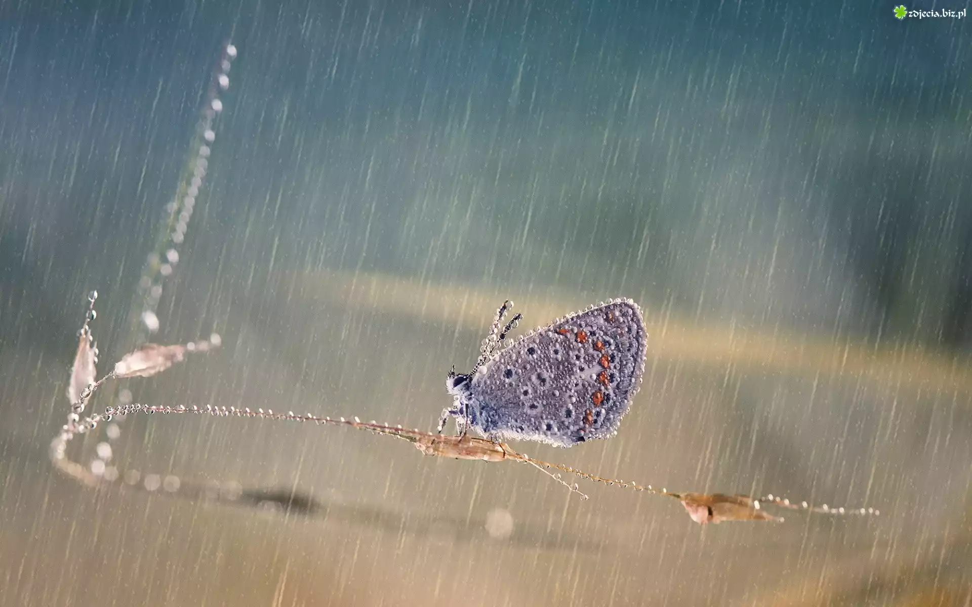 Zdjęcie Modraszek, Motyl, Deszcz, Trawa, Źdźbło
