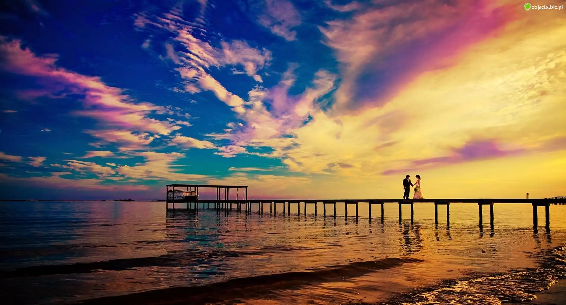 Zdjęcie Molo, Zakochani, Plaża, Niebo, Chmury