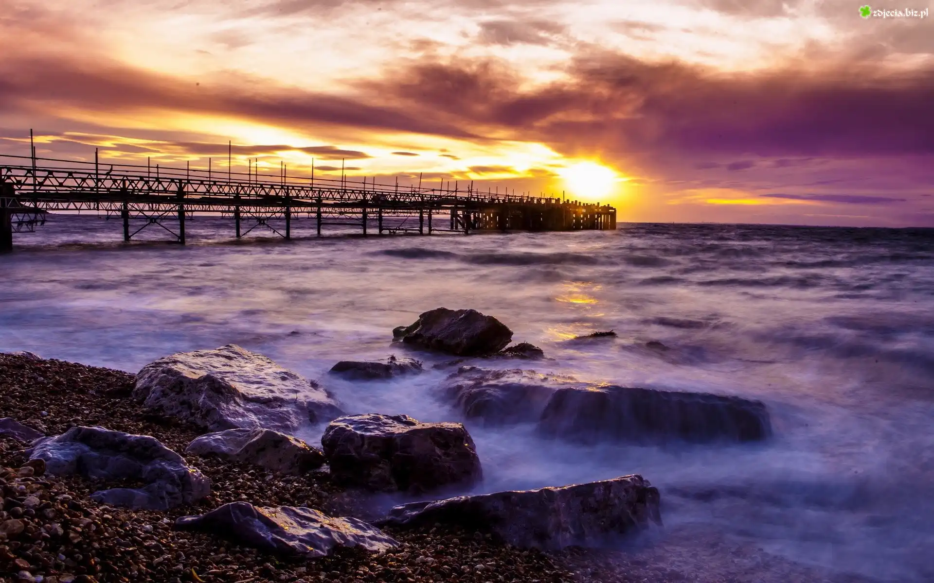Zdjęcie Molo, Chmury, Zachód Słońca, Skały, Fale