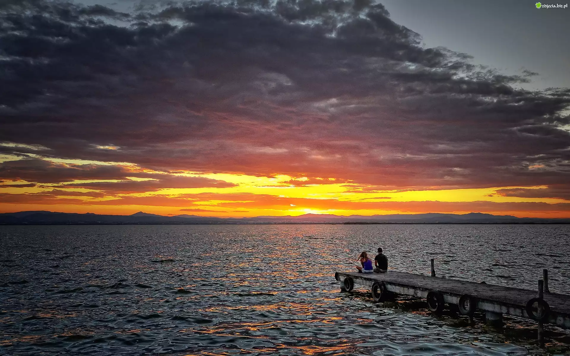 Zdjęcie Jezioro, Molo, Kobieta, Mężczyzna, Góry, Chmury, Zachód, Słońca