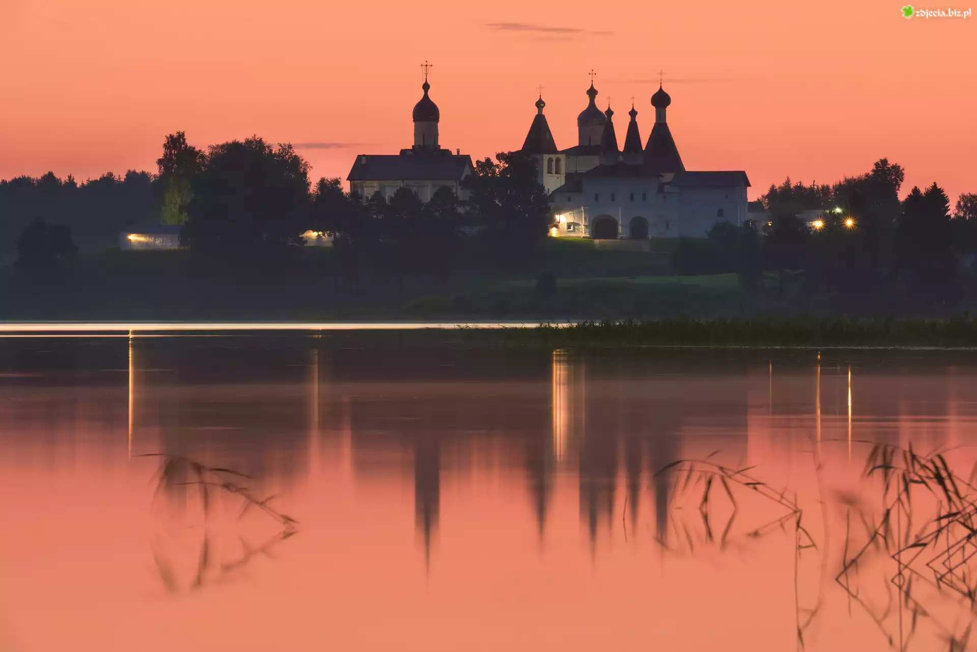 Zdjęcie Zachód słońca, Rzeka, Odbicie, Klasztor, Monaster Terapontowski, Wieś Ferapontovo, Obwód wołogodzki, Rosja |