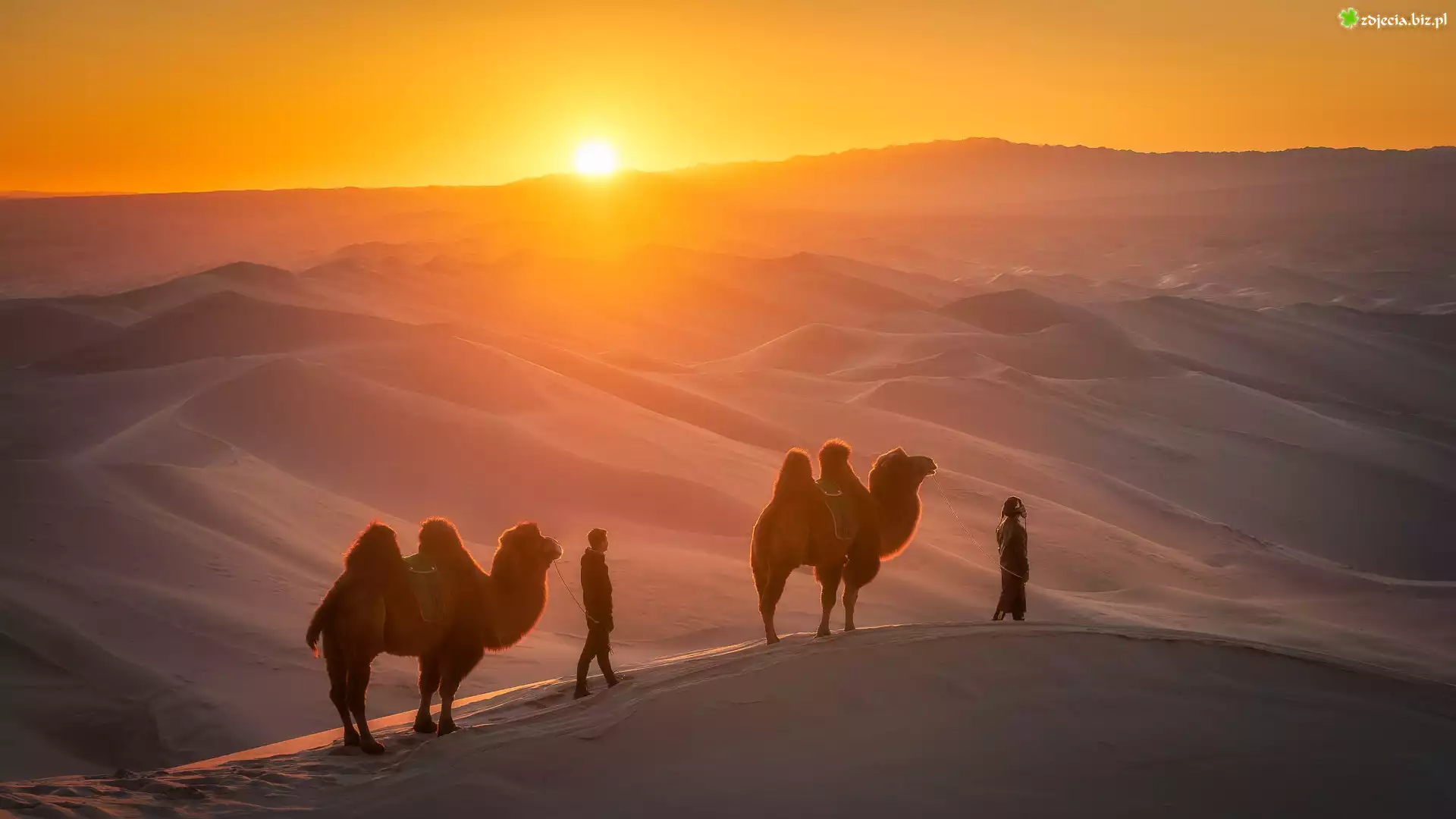 Zdjęcie Mongolia, Pustynia, Gobi, Wydmy, Karawana, Wielbłądy, Człowiek, Zachód słońca