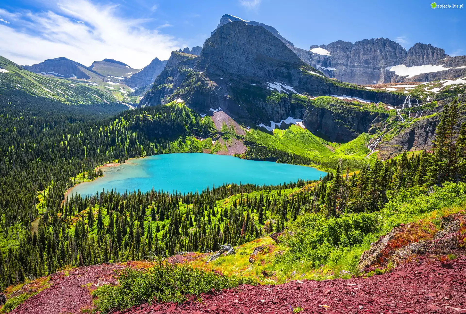 Zdjęcie Park Narodowy Glacier, Jezioro, Grinnell Lake, Góry, Lasy, Niebo, Montana, Stany Zjednoczone |