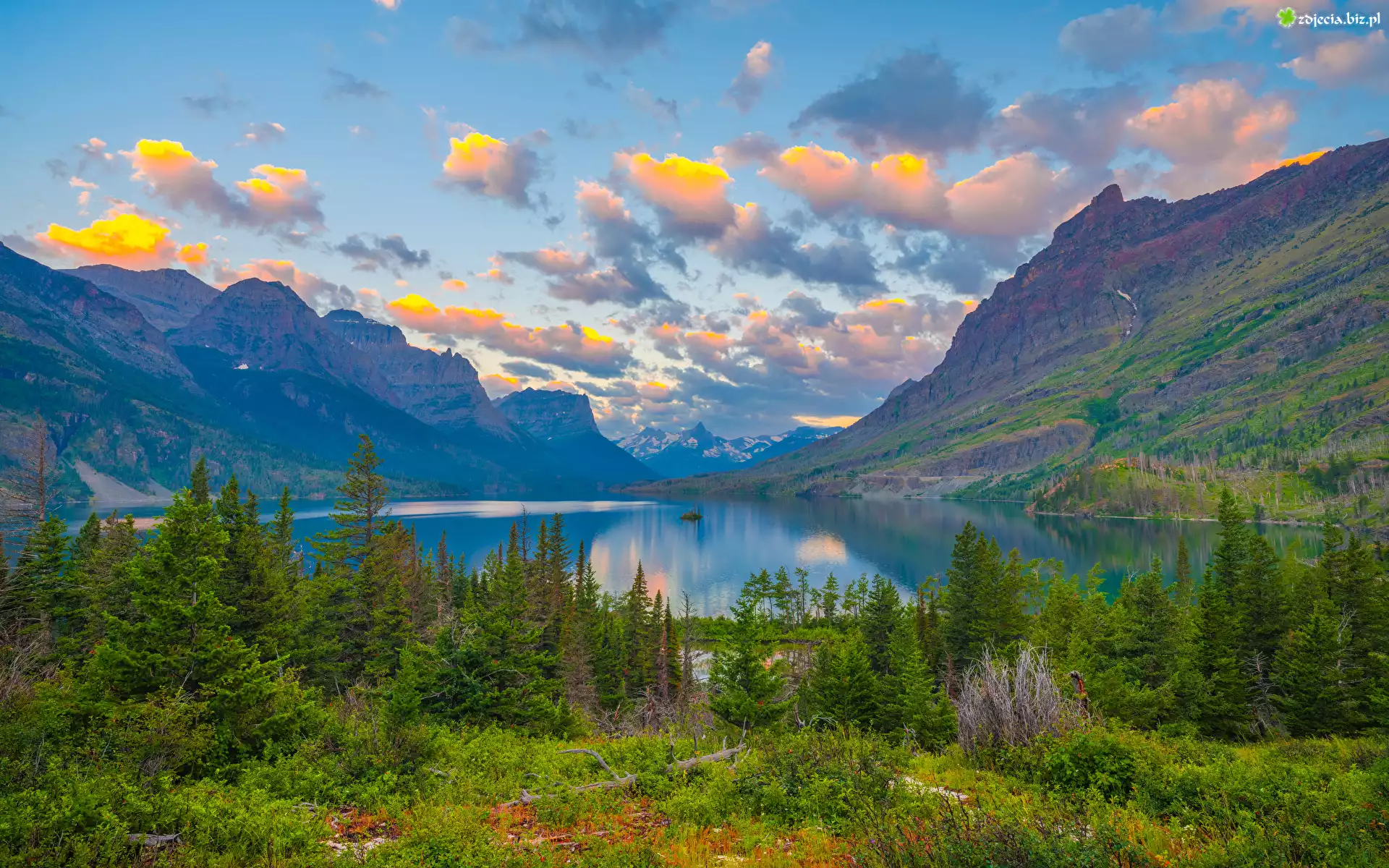 Zdjęcie Stany Zjednoczone, Stan Montana, Park Narodowy Glacier, Jezioro, Drzewa, Góry, Niebo, Kolorowe, Chmury |