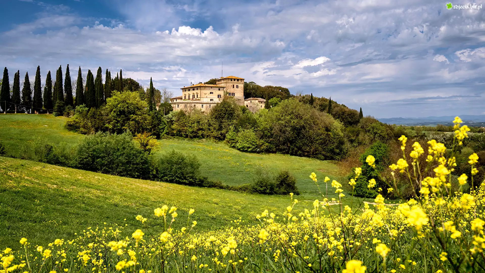 Zdjęcie Włochy, Toskania, Prowincja Siena, Toskania, Villa Montesoli, Łąka, Kwiaty, Drzewa, Wzgórza