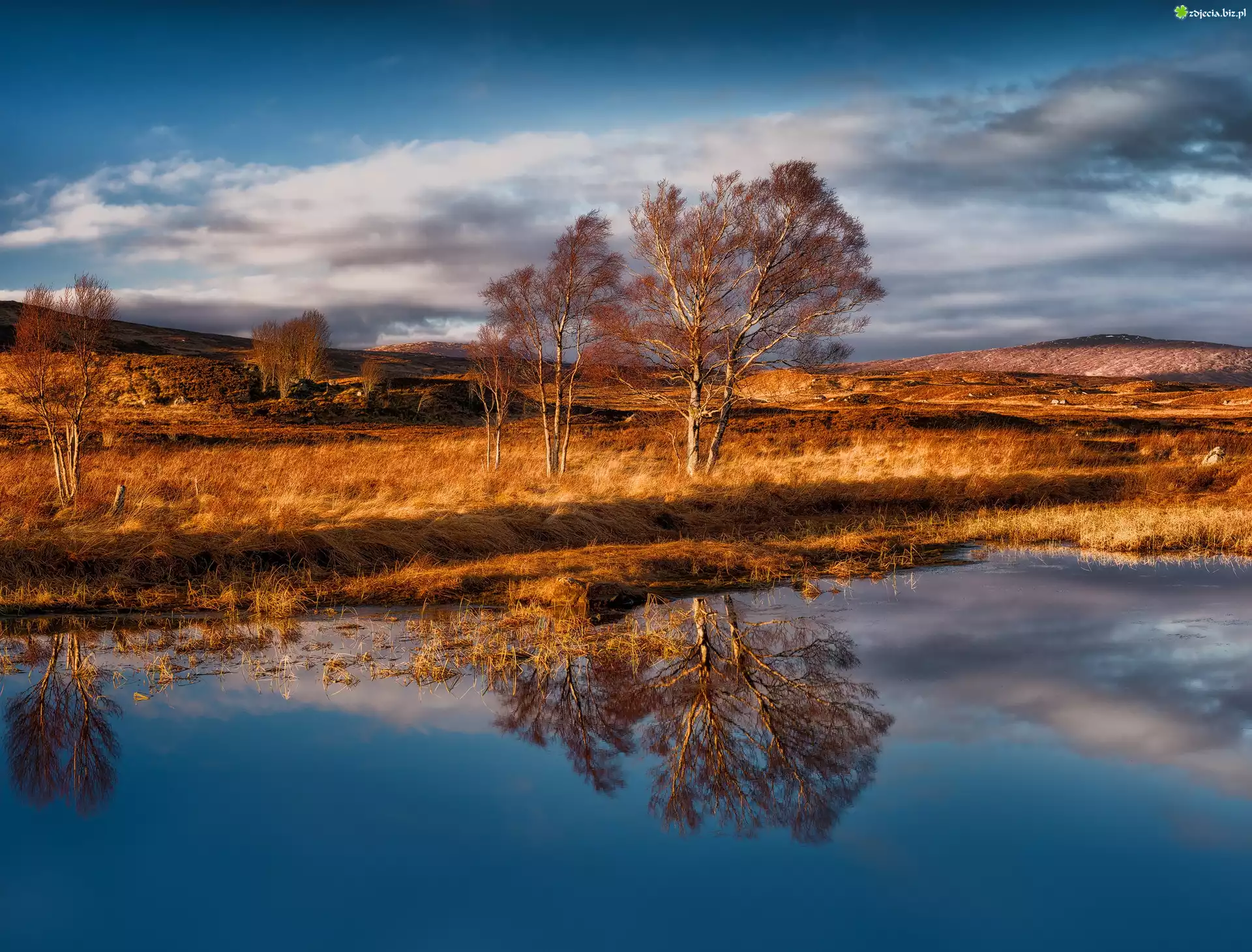 Zdjęcie Szkocja, Region Highlands, Góry Rannoch Moor, Jezioro Loch Bà, Jesień, Drzewa