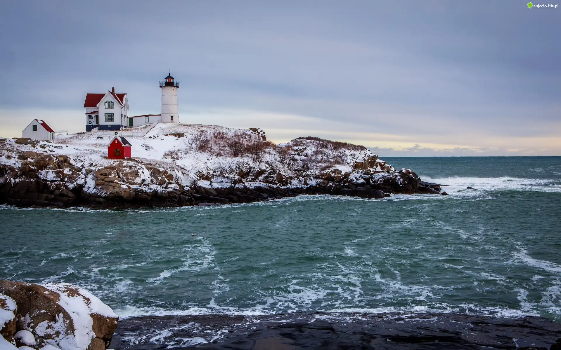 Zdjęcie Latarnia, Morska, Domy, Skały, Morze, Fale, Zima