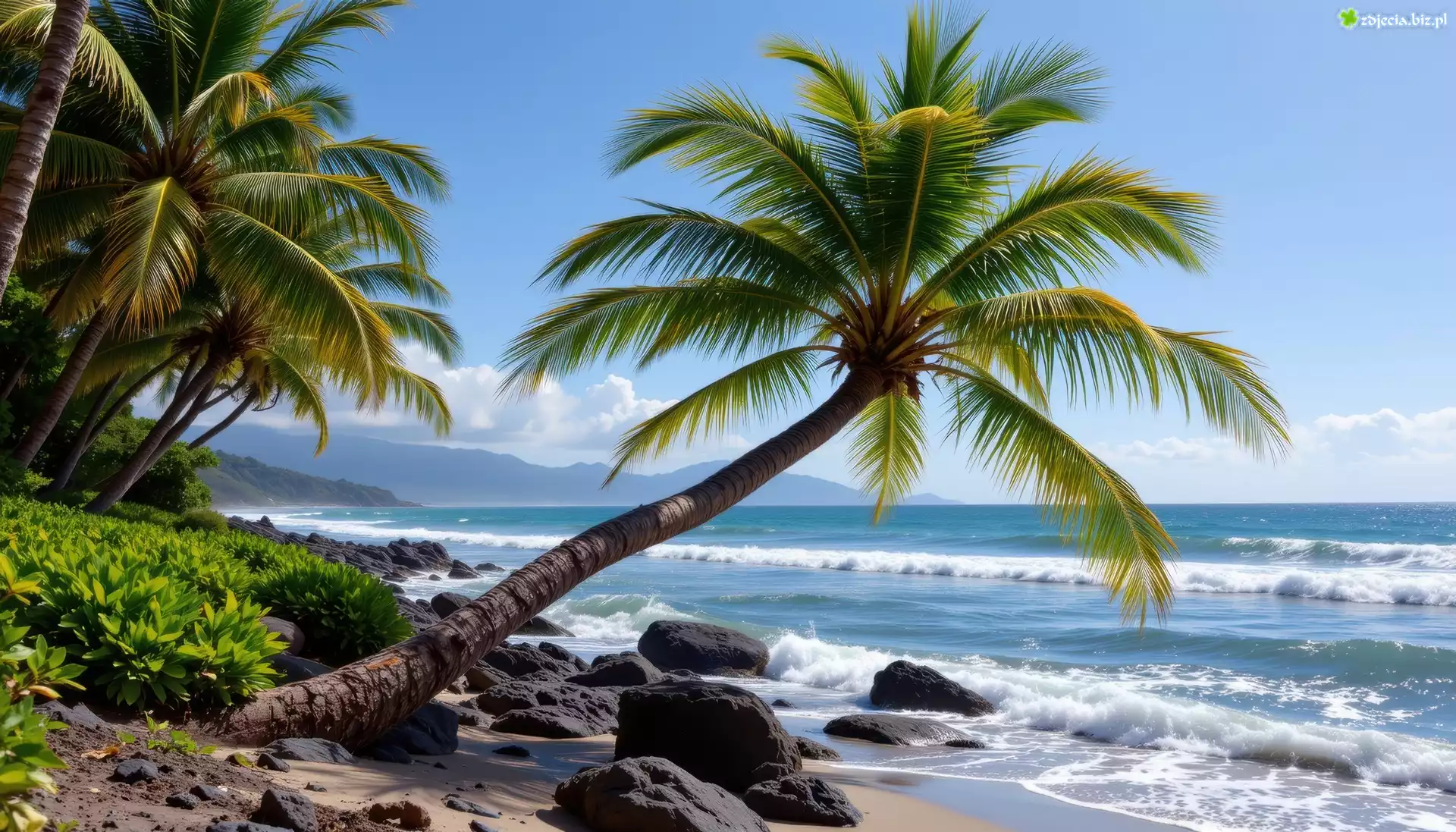Zdjęcie Palmy, Plaża, Kamienie, Morze, Grafika AI