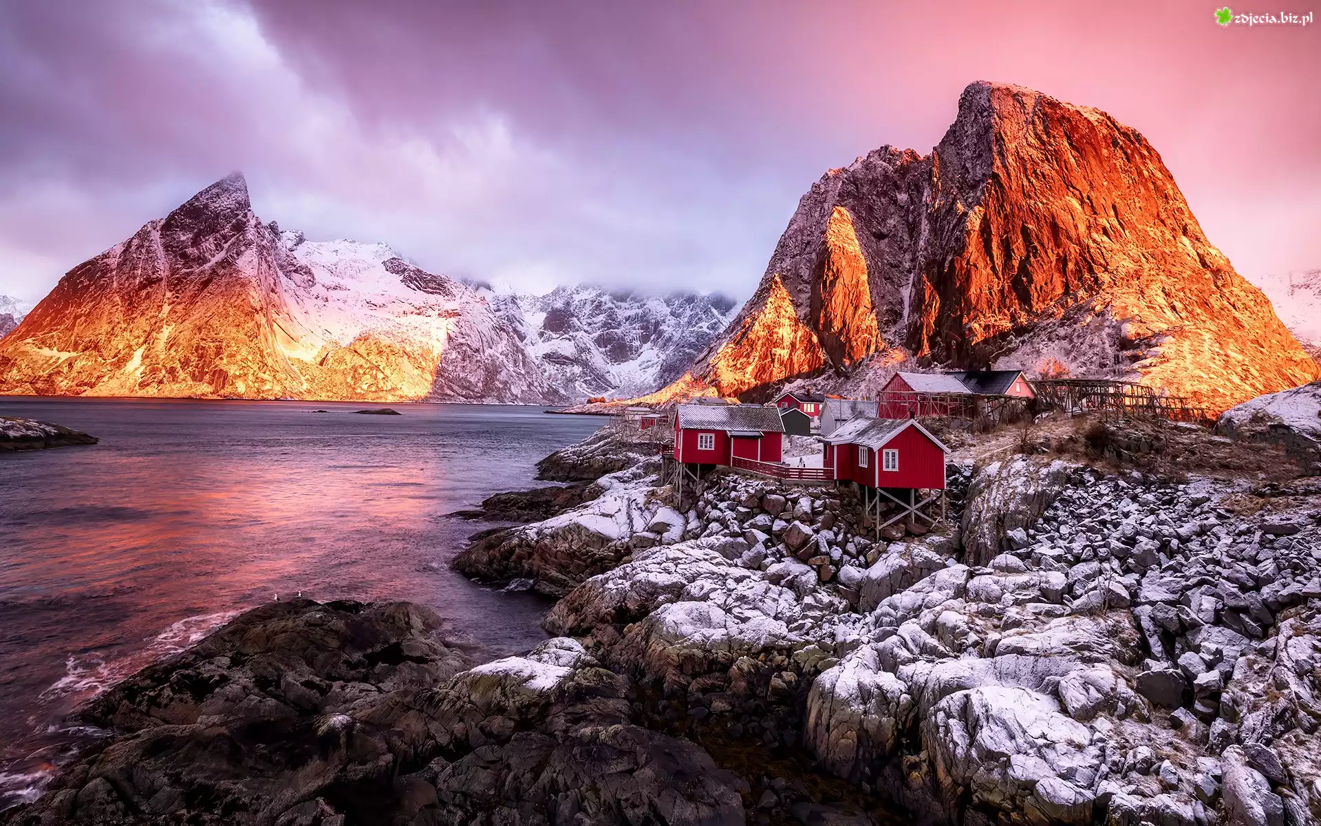 Zdjęcie Morze Norweskie, Lofoty, Góry, Domy, Wioska Hamnoy, Skały, Chmury, Norwegia