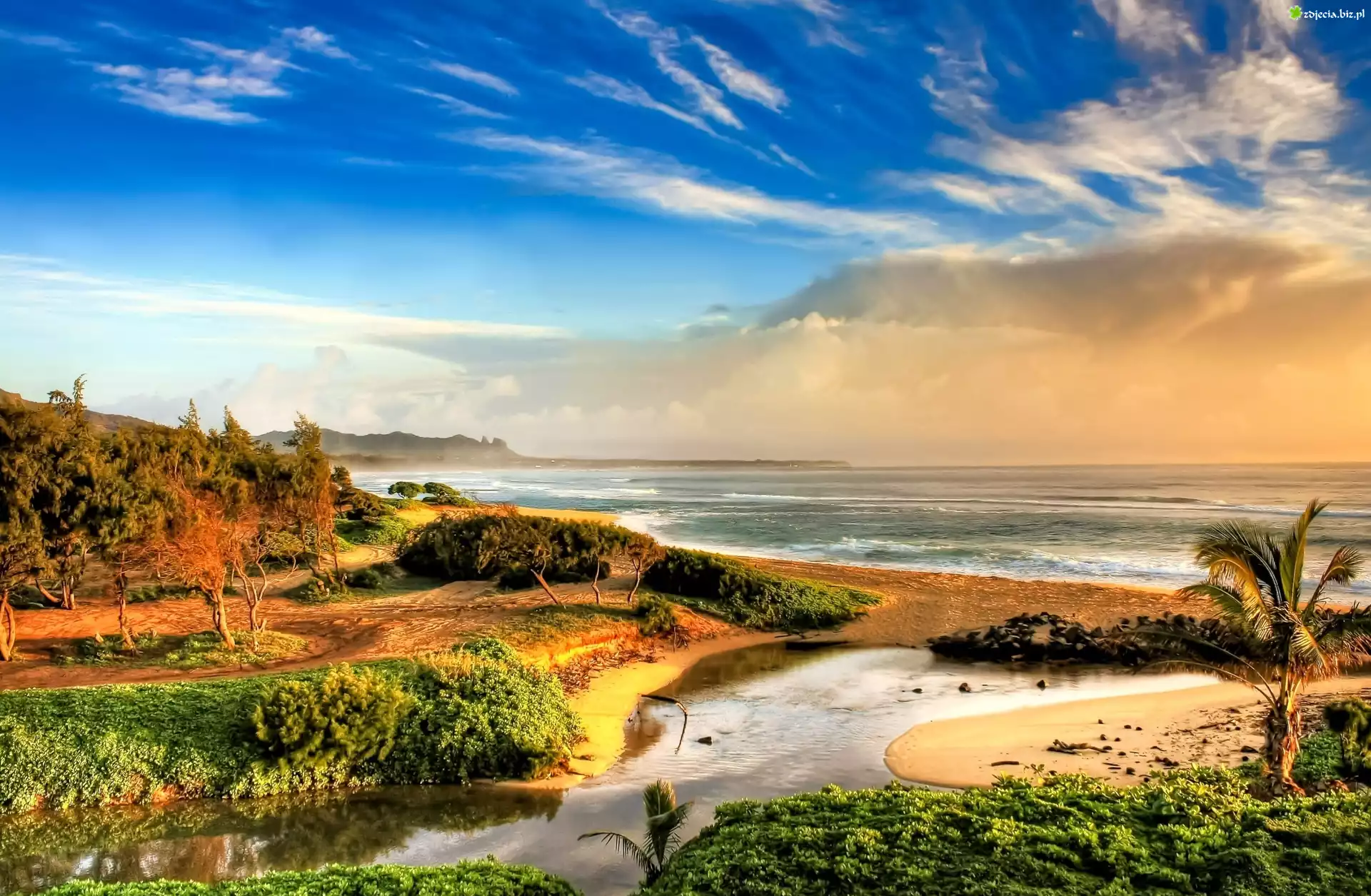 Zdjęcie Morze, Drzewa, Niebo, Chmury, Dopływ