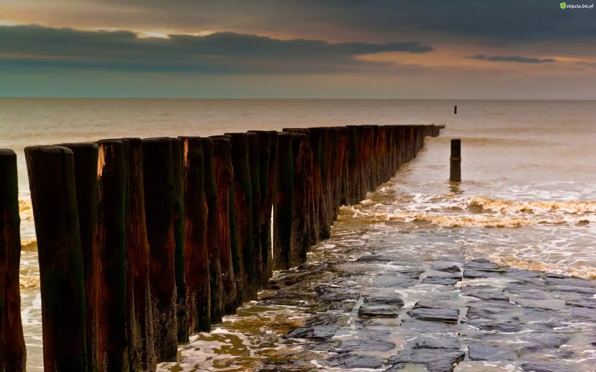 Zdjęcie Morze, Pale, Chmury, Kamienie