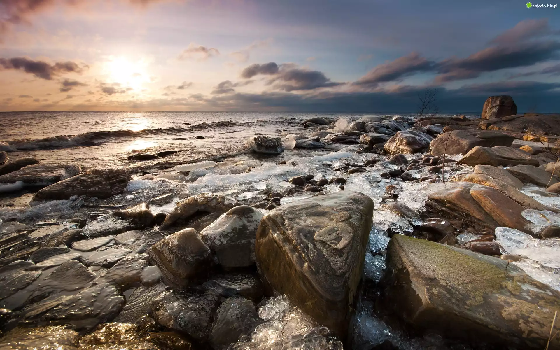 Zdjęcie Morze, Zachód, Słońca, Chmury, Kamienie