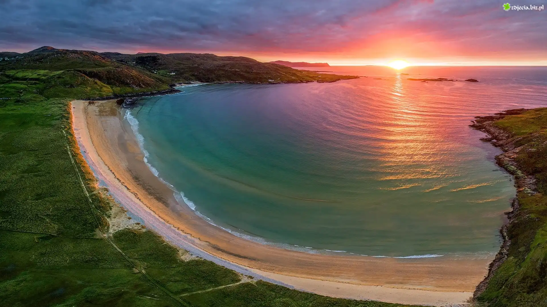 Zdjęcie Morze, Wybrzeże, Plaża, Tra Na Rosann Beach, Skały, Roślinność, Zachód słońca, Półwysep Rosguill, Hrabstwo Donegal, Irlandia |