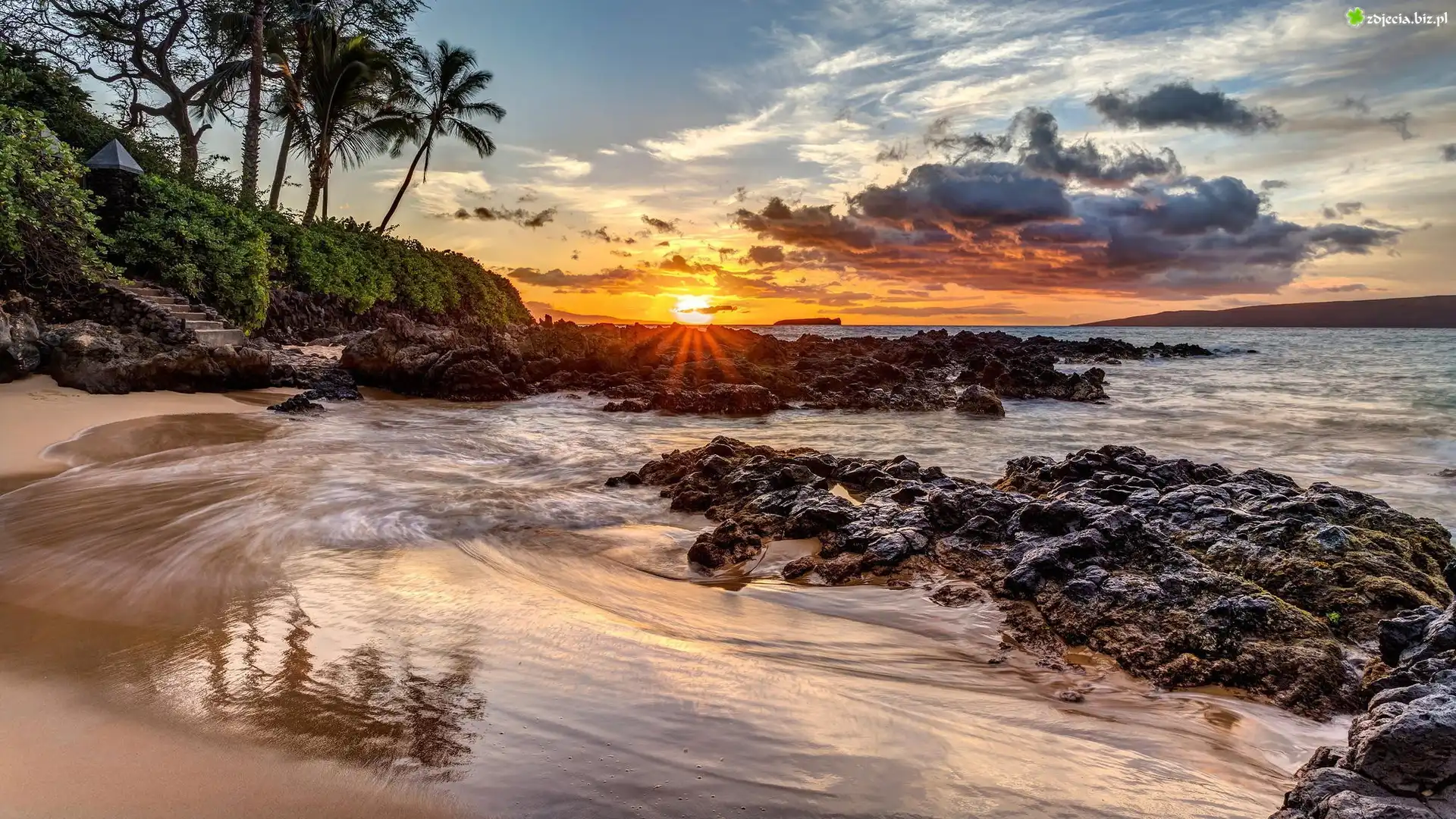 Zdjęcie Morze, Zachód słońca, Chmury, Drzewa, Skały