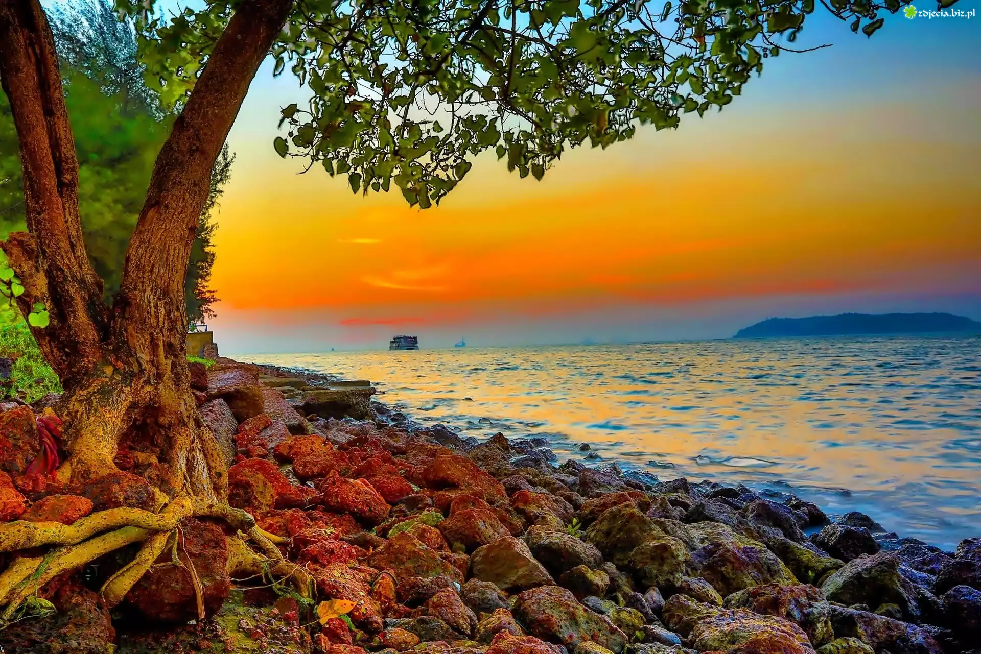Zdjęcie Morze, Kamienie, Zachód Słońca, Drzewo, Wybrzeże