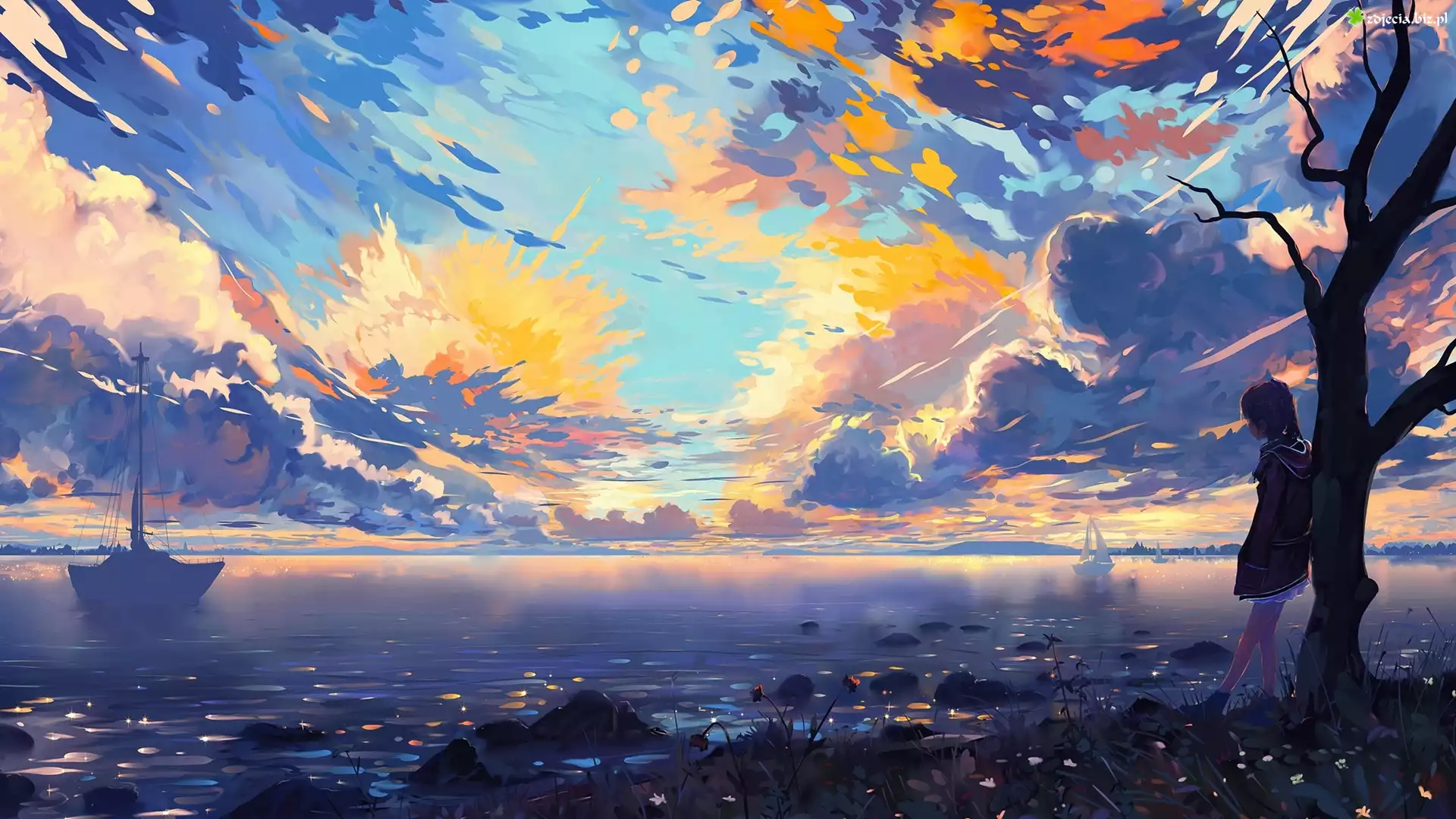 Zdjęcie Morze, Chmury, Żaglówki, Dziewczyna Paintography