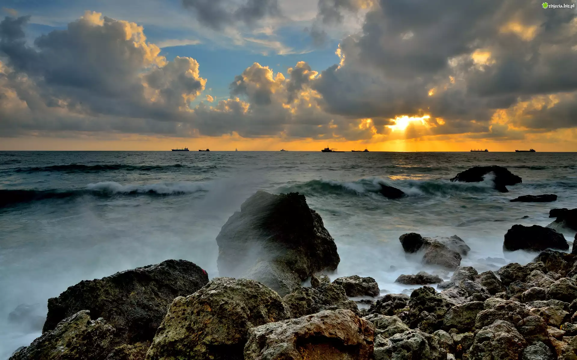 Zdjęcie Morze, Kamienie, Chmury, Fale, Niebo