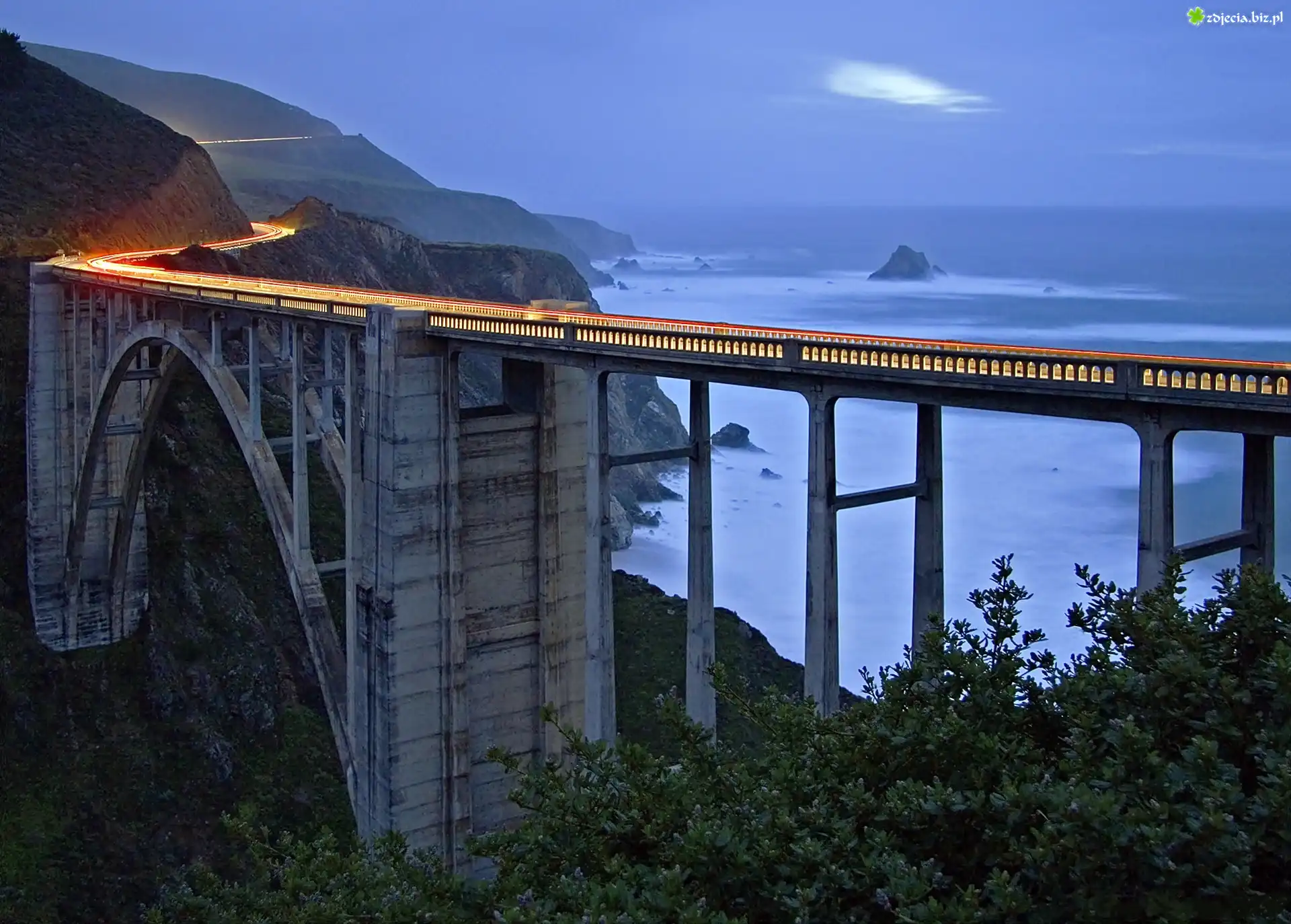 Zdjęcie, Góry, Morze, Most, Oświetlona, Droga, Drzewa, Rozmycie