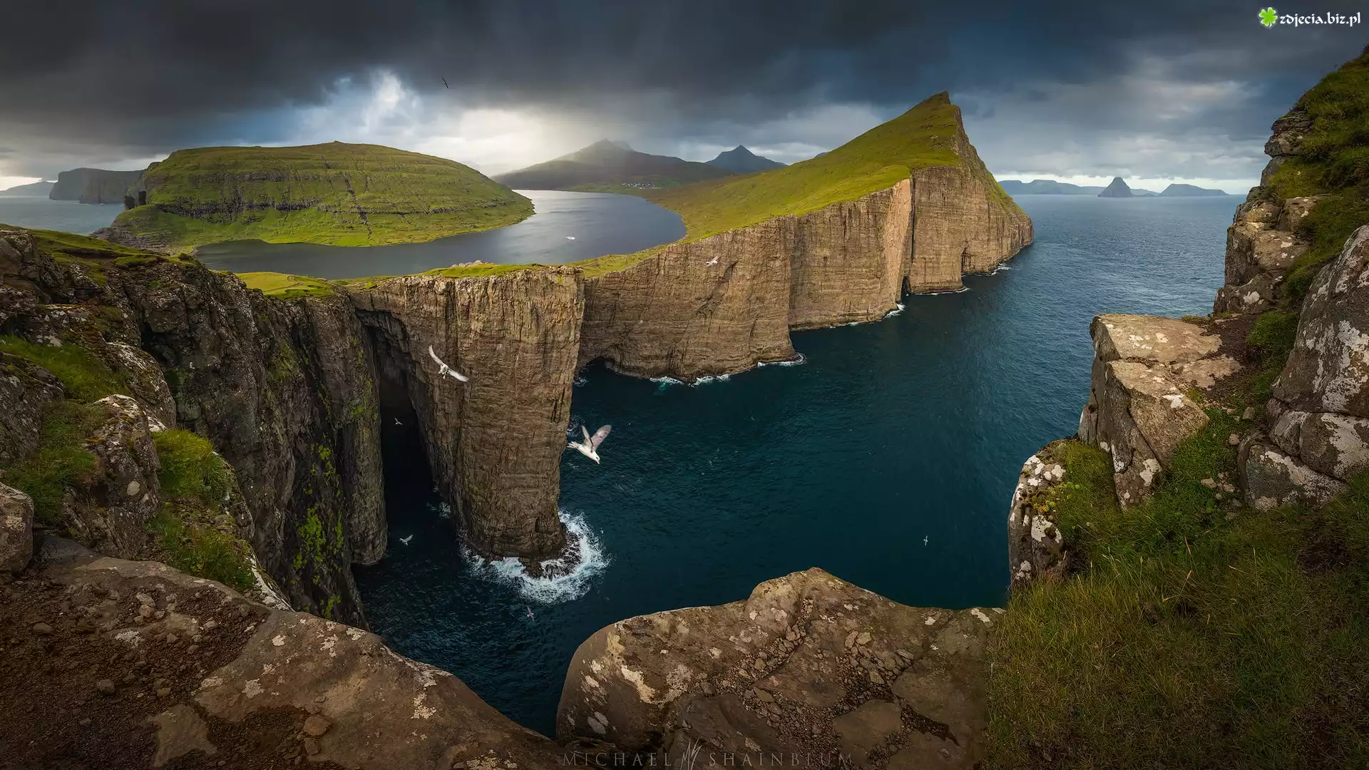 Zdjęcie Morze, Klif, Wzgórza, Góry, Jezioro Sorvagsvatn, Ptaki, Chmury, Wyspa Vagar, Wyspy Owcze, Dania |
