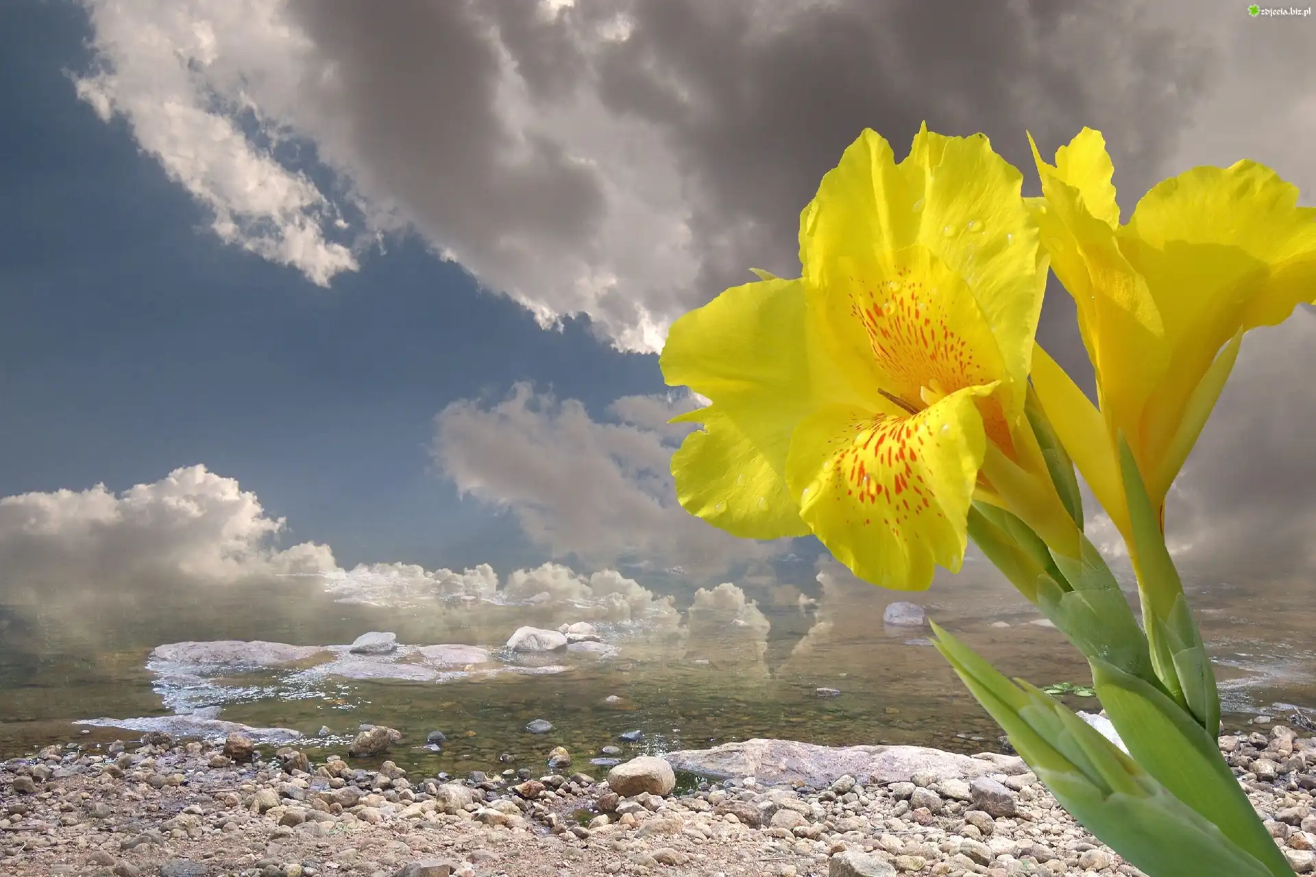 Zdjęcie, Żółty, Irys, Morze, Chmury