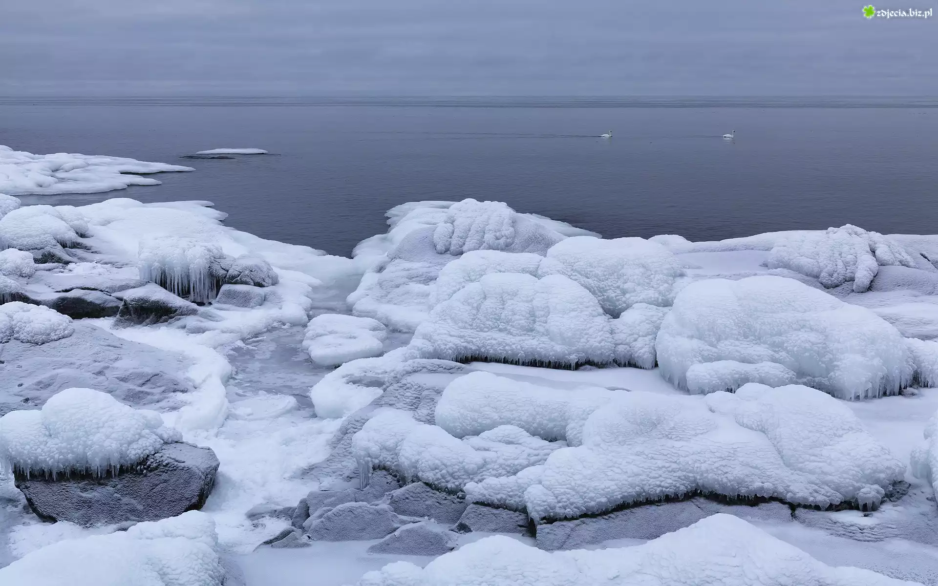 Zdjęcie Morze, Kamienie, Brzeg, Kaczki, Zima