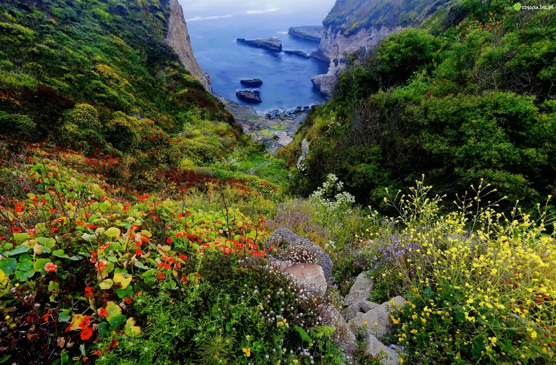 Zdjęcie Morze, Wybrzeże, Las, Kamienie, Kwiaty