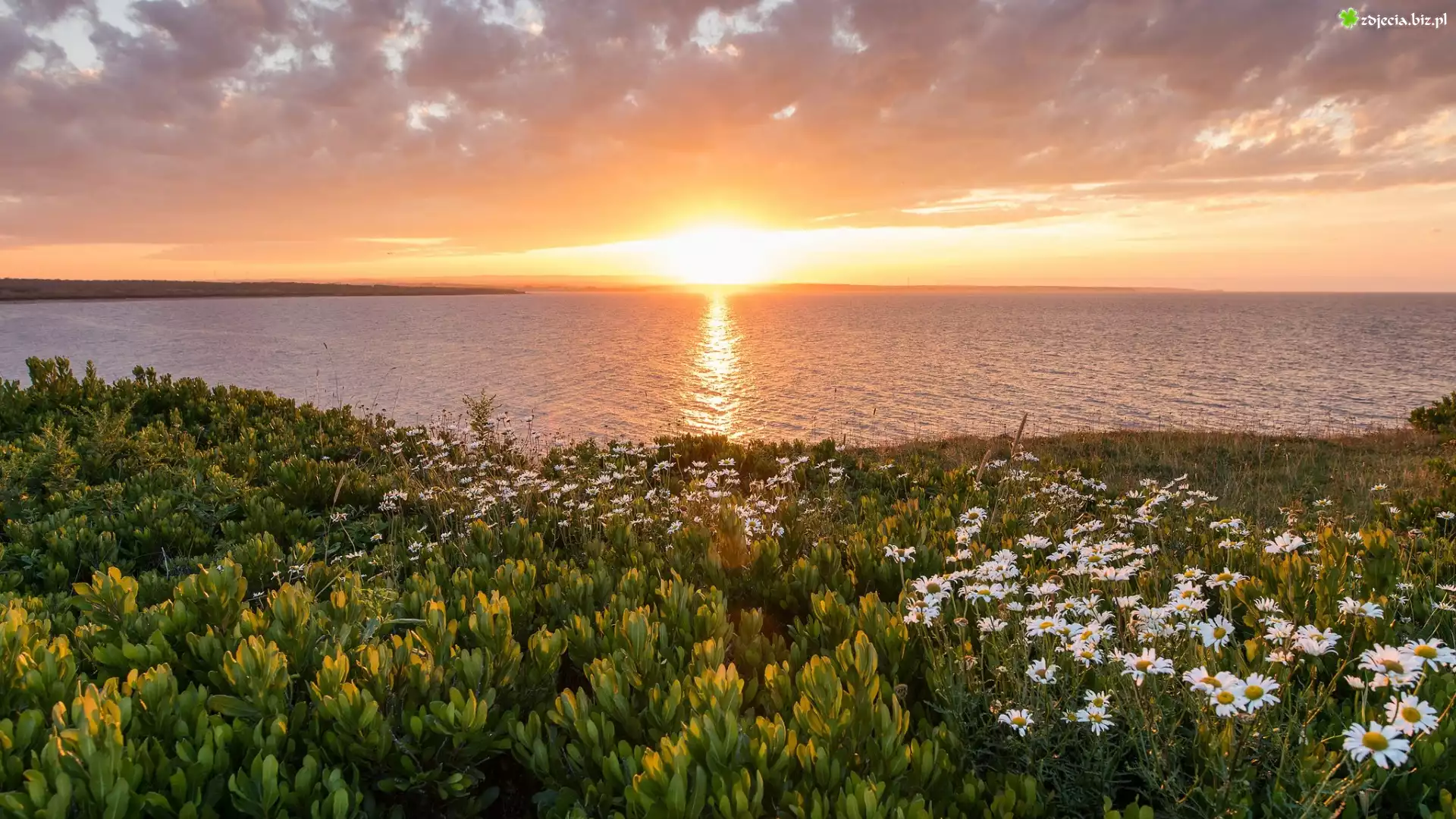 Zdjęcie Kanada, Nowa Szkocja, Zachód słońca, Morze - Ocean Atlantycki, Brzeg, Kwiaty, Złocień, Rośliny |