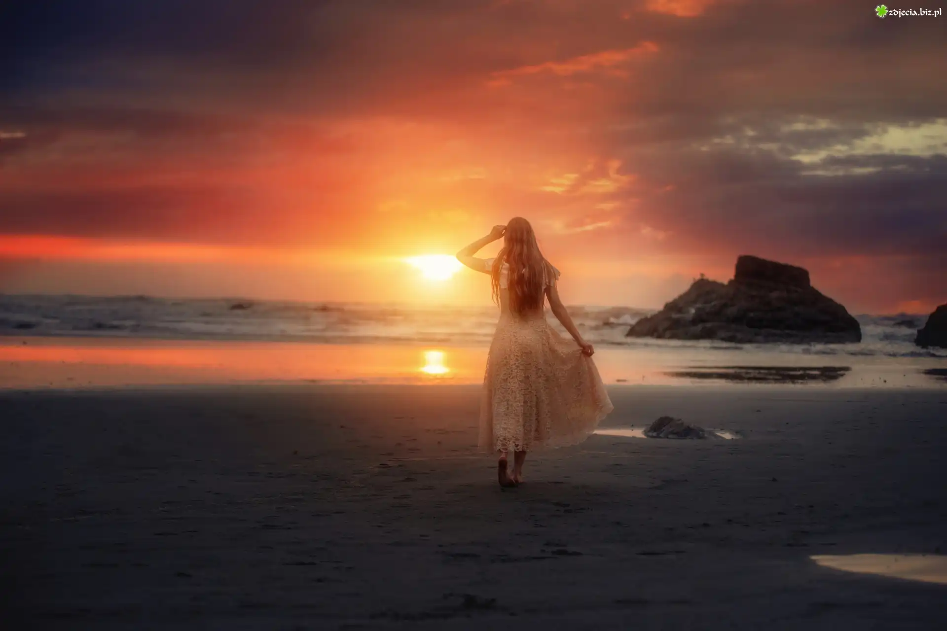 Zdjęcie Morze, Zachód, Słońca, Kobieta, Skała
