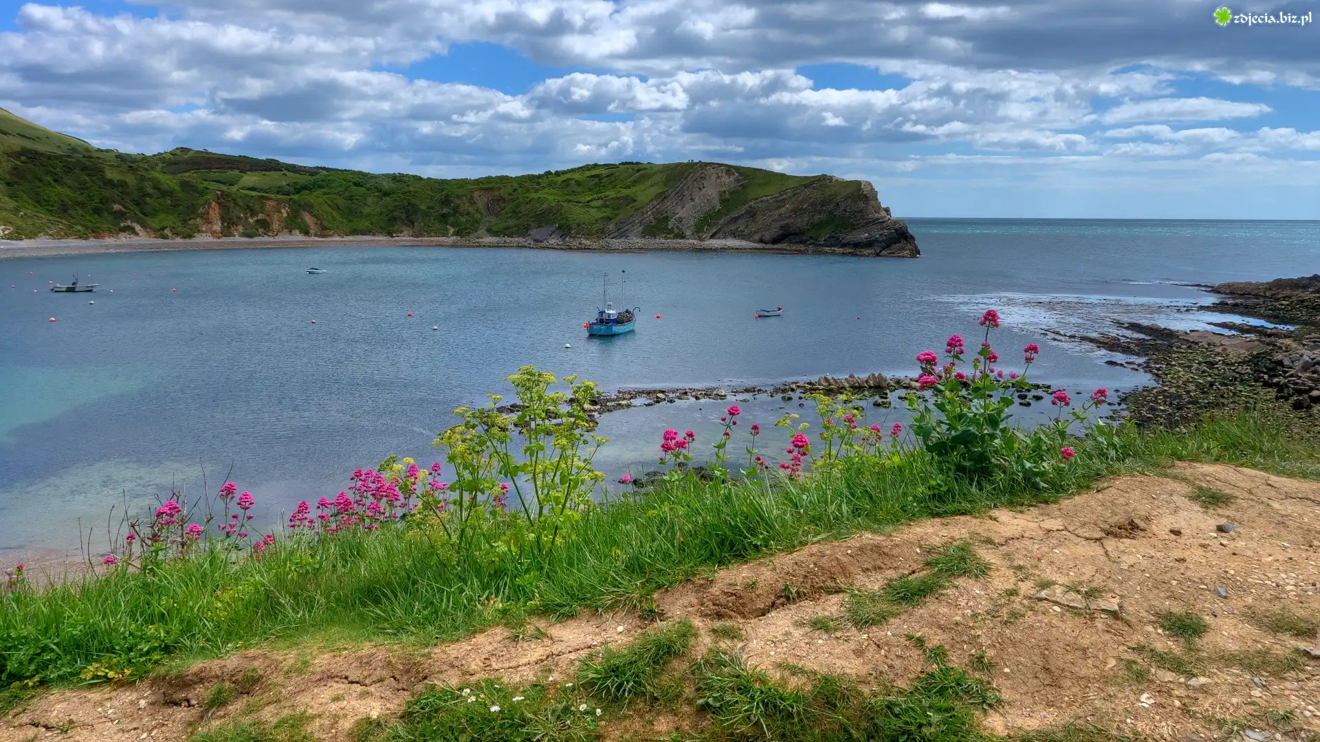 Zdjęcie Morze, Zatoka, Kuter, Łódki, Kwiaty, Niebo