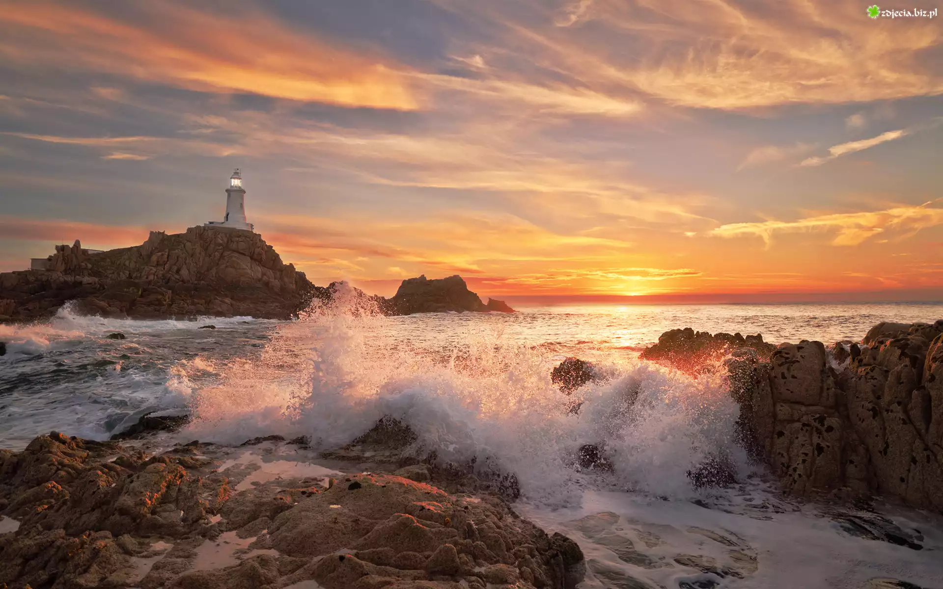 Zdjęcie Morze, Zachód słońca, Fale, Latarnia morska