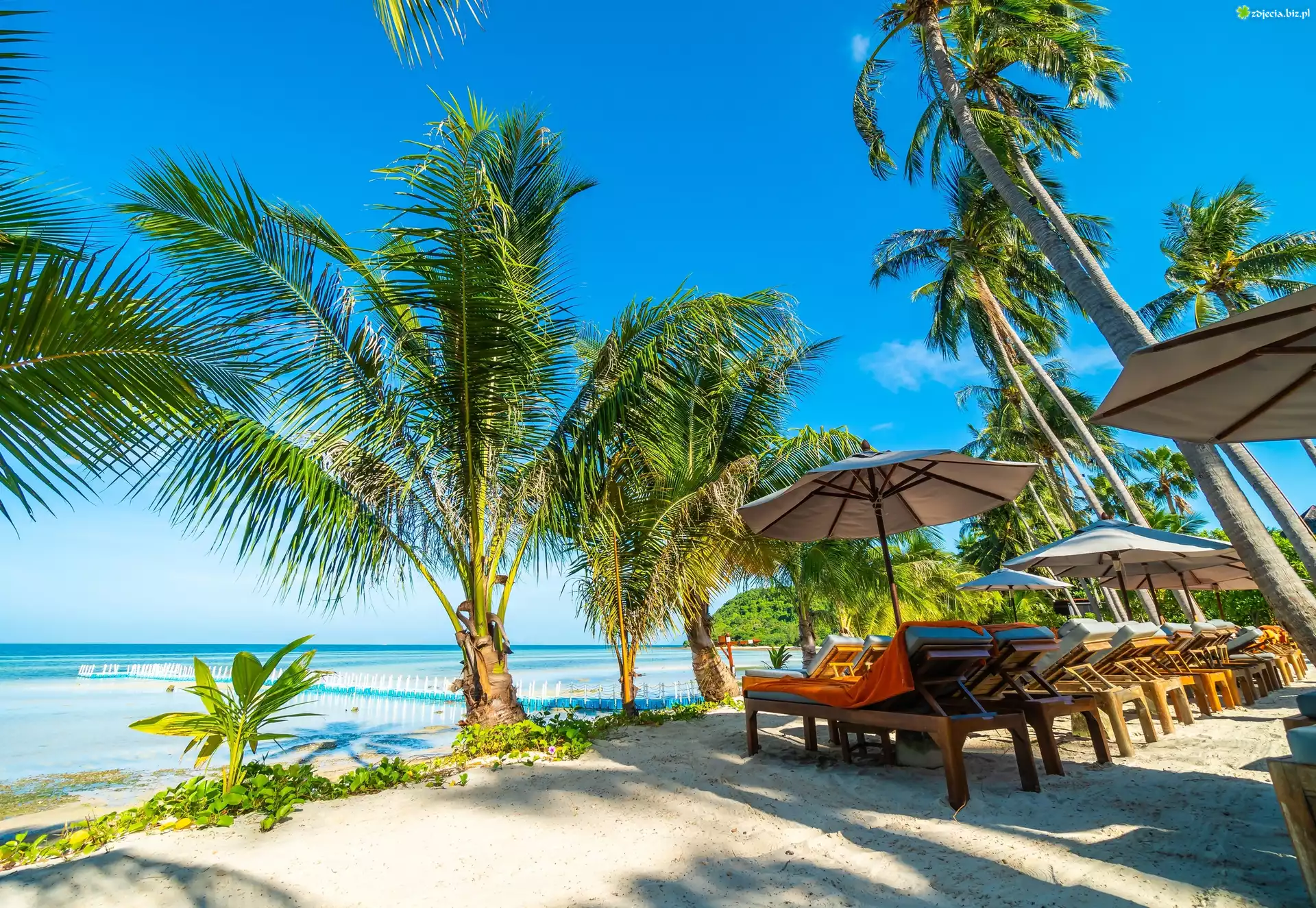 Zdjęcie, Morze, Palmy, Leżaki, Wakacje