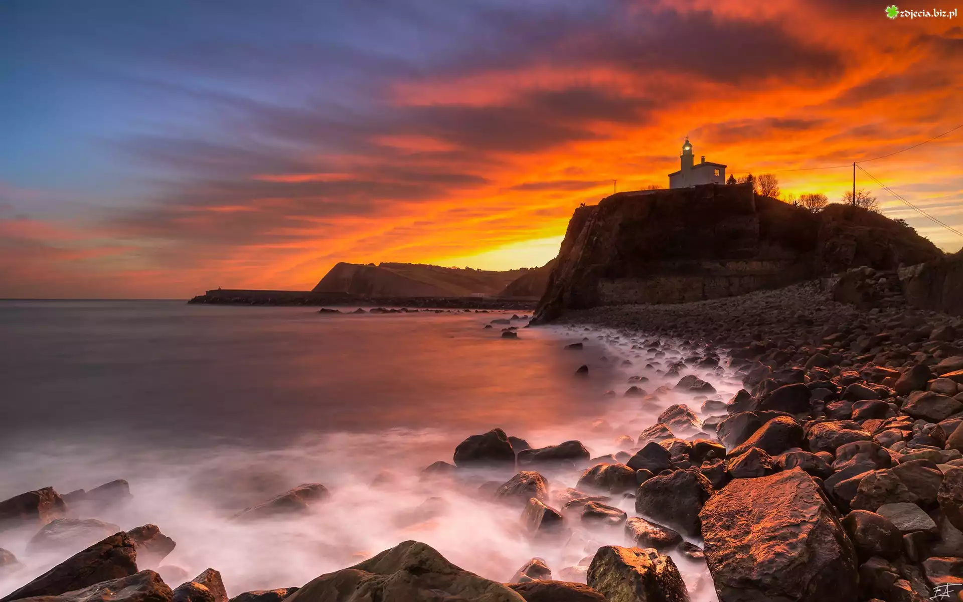 Zdjęcie, Morze, Zachód słońca, Kamienie, Niebo, Latarnia