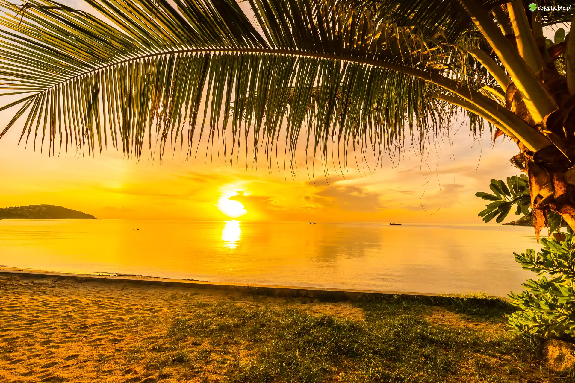 Zdjęcie Zachód słońca, Niebo, Morze, Palmy, Plaża, Tropiki