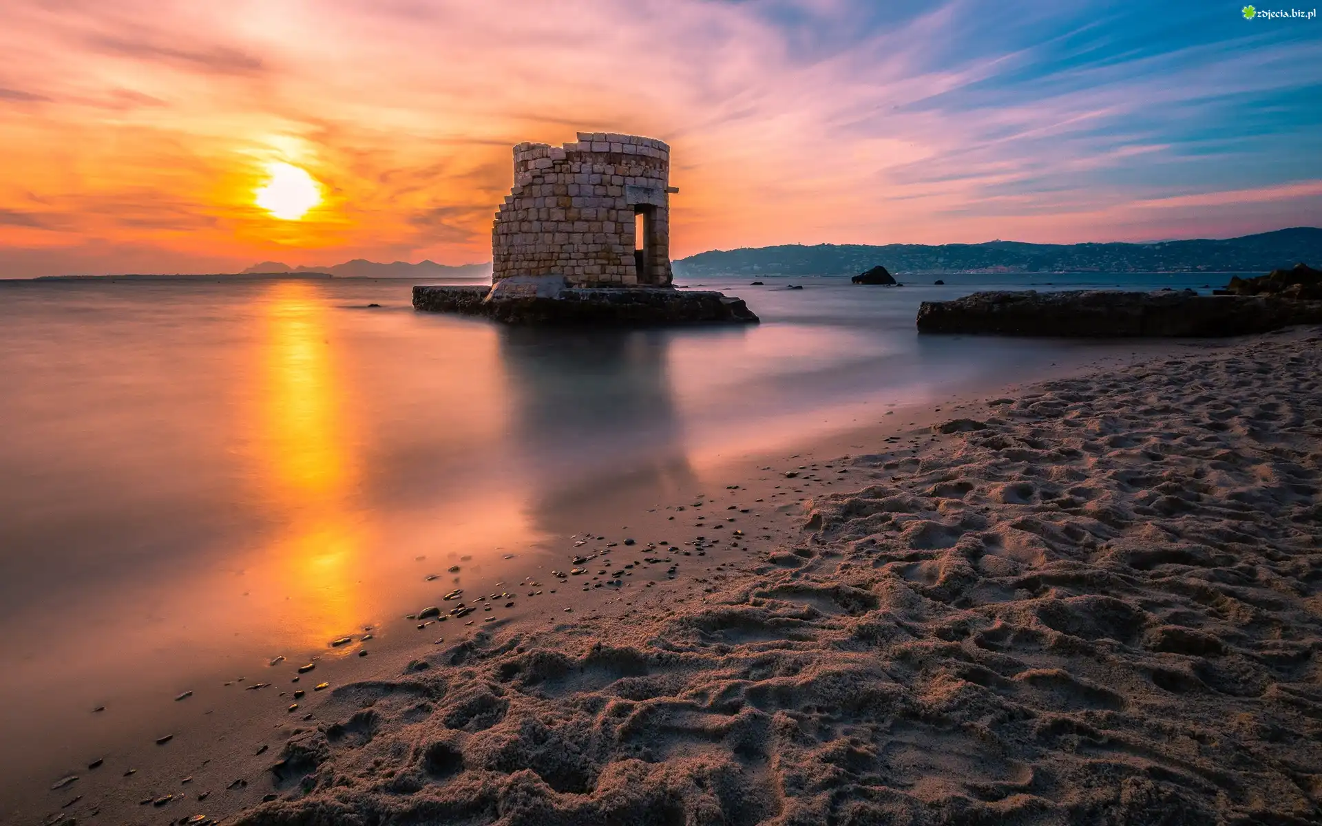 Zdjęcie, Morze, Zachód słońca, Niebo, Piasek
