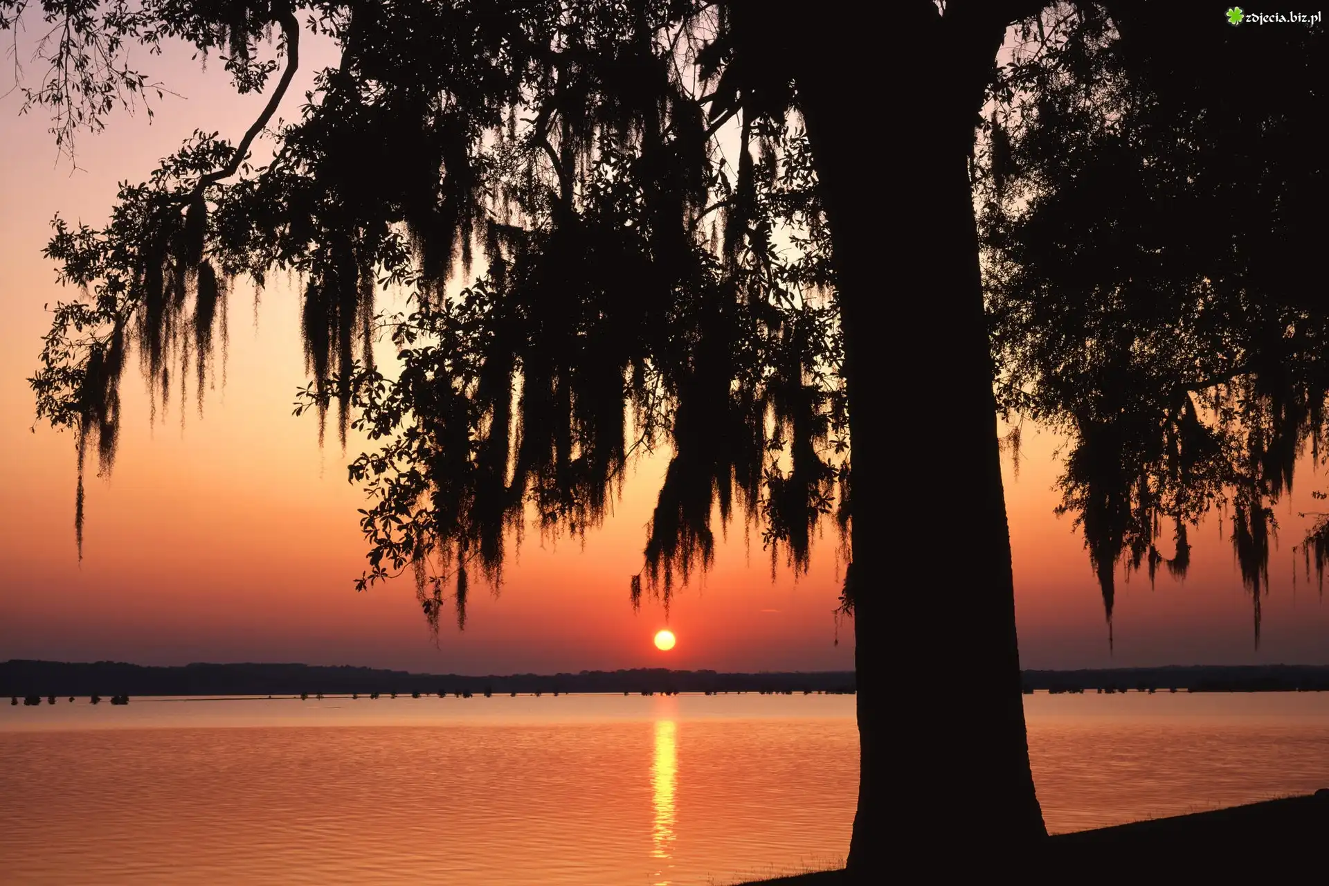 Zdjęcie Morze, Zachód, Słońca, Odbicie, Drzewo