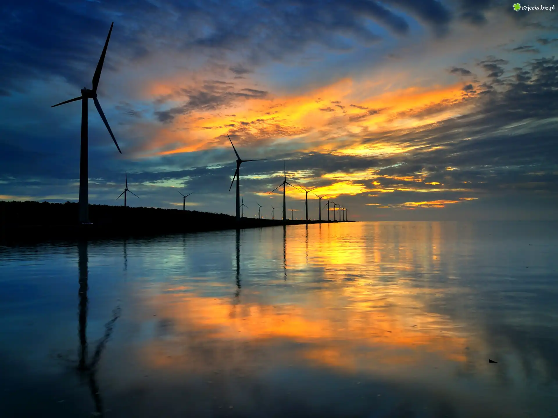 Zdjęcie Morze, Niebo, Zachód, Słońca, Odbicie, Wiatraki