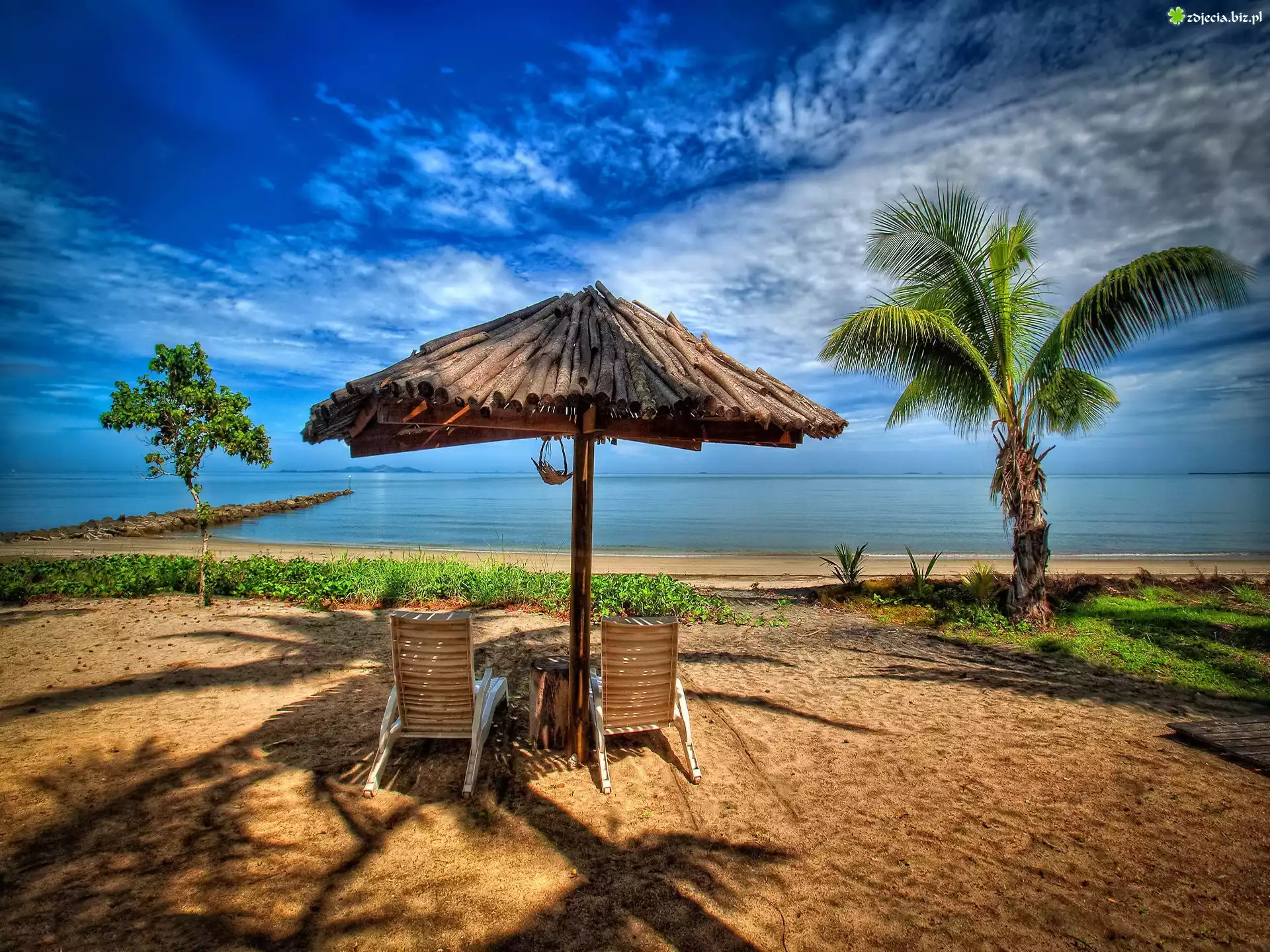 Zdjęcie Morze, Palmy, Parasol, Leżaki, Wakacje