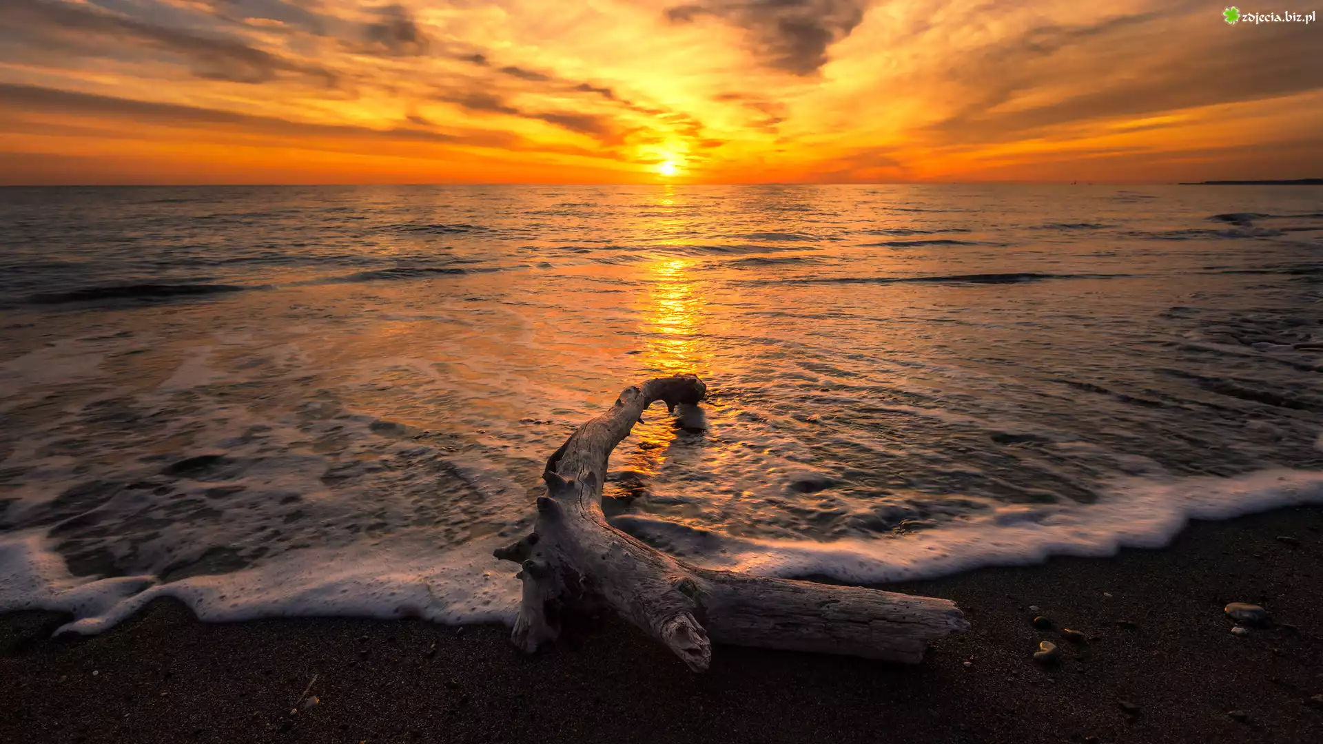 Zdjęcie Uschnięty, Konar, Plaża, Morze, Fale, Zachód słońca