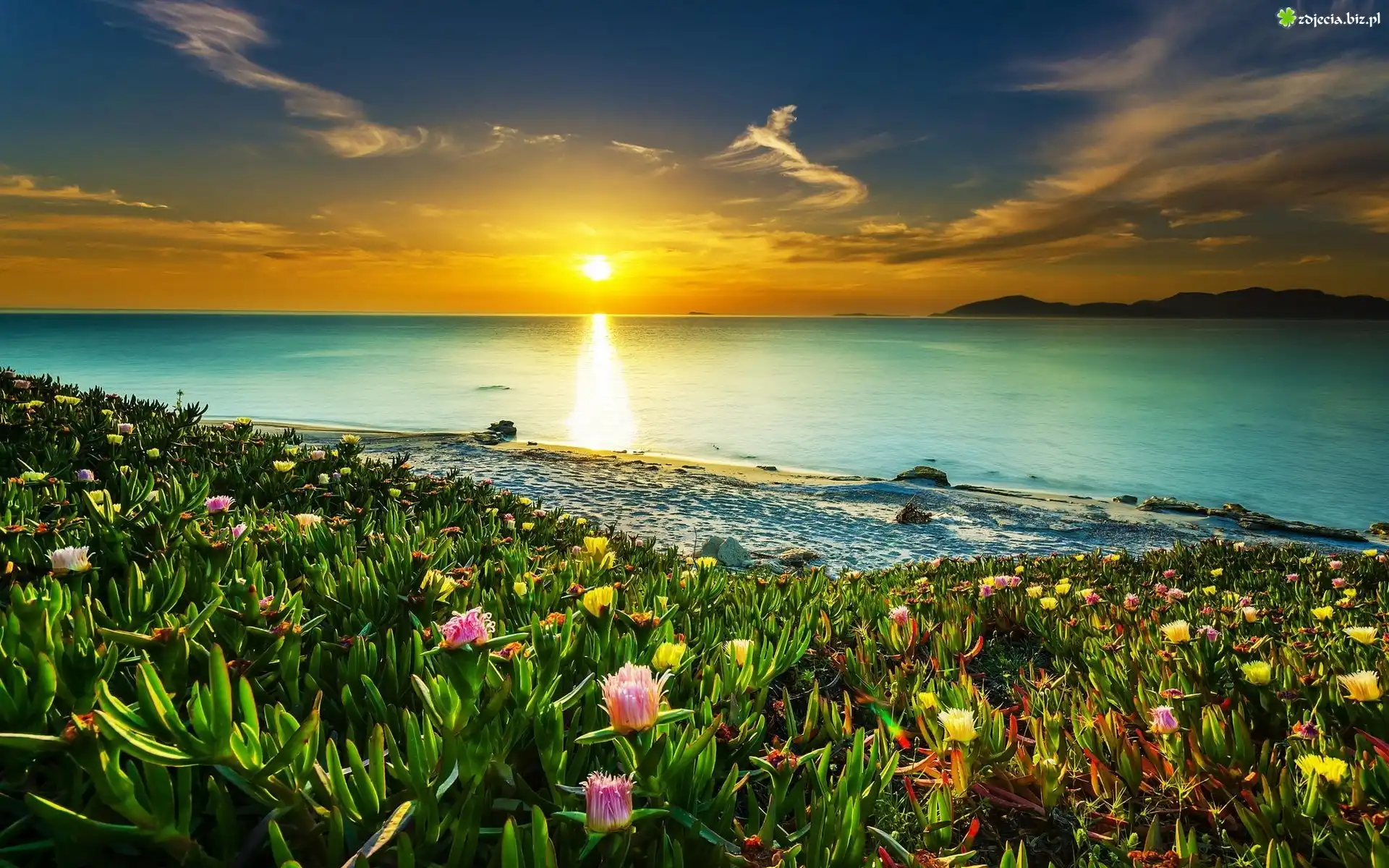 Zdjęcie, Morze, Zachód słońca, Plaża, Kwiaty