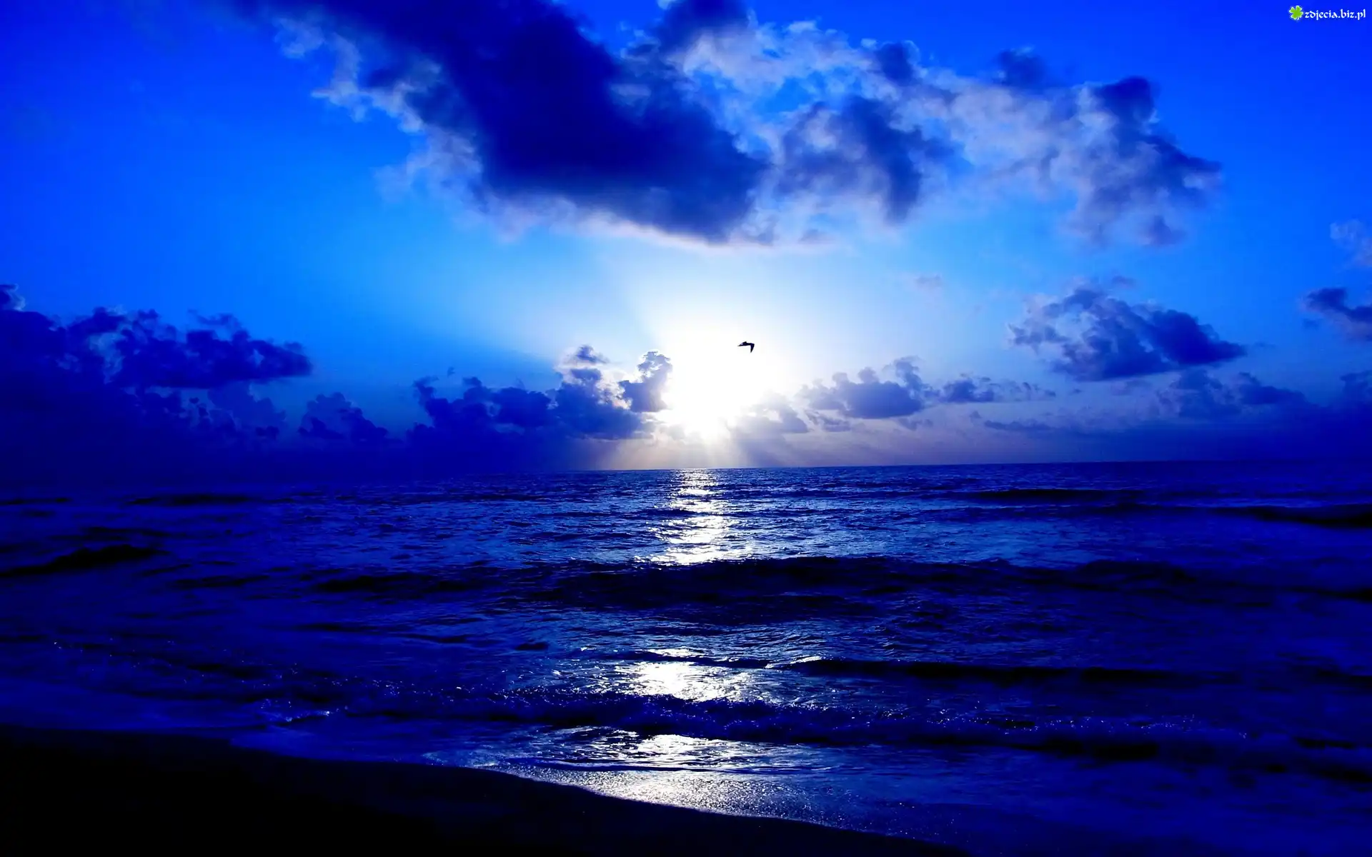Zdjęcie Morze, Chmury, Świt, Przebijające, Słońce
